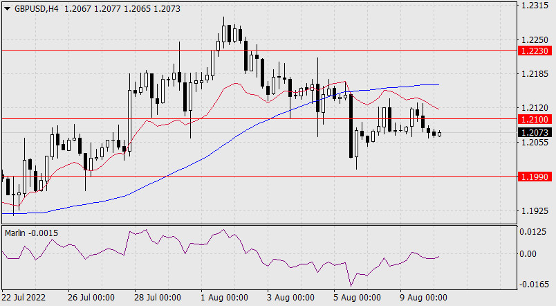 Прогноз по GBP/USD на 10 августа 2022 годаИнстаФорекс - Instaforex, 3 года назад Фунт стерлингов вчера повторил попытку в преодолении уровня сопротивления 1.2100 которая была ещё в понедельник. Результат оказался таким же – сразу после выхода цена была сброшена обратно вниз. Осциллятор Марлин медленно снижается, приближаясь к границе с территорией «медведей». Первой целью нисходящего движения является индикаторная линия Крузенштерна на отметке 1.1990. Переход цены под неё открывает вторую цель 1.1800.