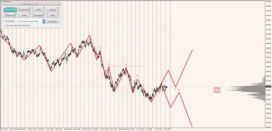 Долгосрочная тенденция: в шорт. Максимальное скопление объемов текущего контракта расположено в диапазоне по котировкам 0.62126-0.62620. В настоящий момент по паре совершаются инвестиционные операции внутри указанного диапазона, указывая на временную неопределенность.