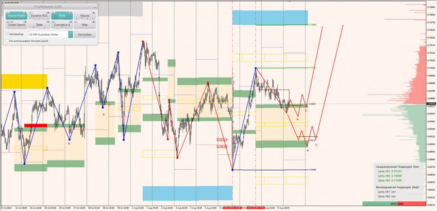 Среднесрочная тенденция: в лонг. Максимальное скопление объемов среднесрочной тенденции расположено в диапазоне по котировкам 0.69018-0.69111. В настоящий момент по паре совершаются инвестиционные операции выше, указывая на силу покупателей.