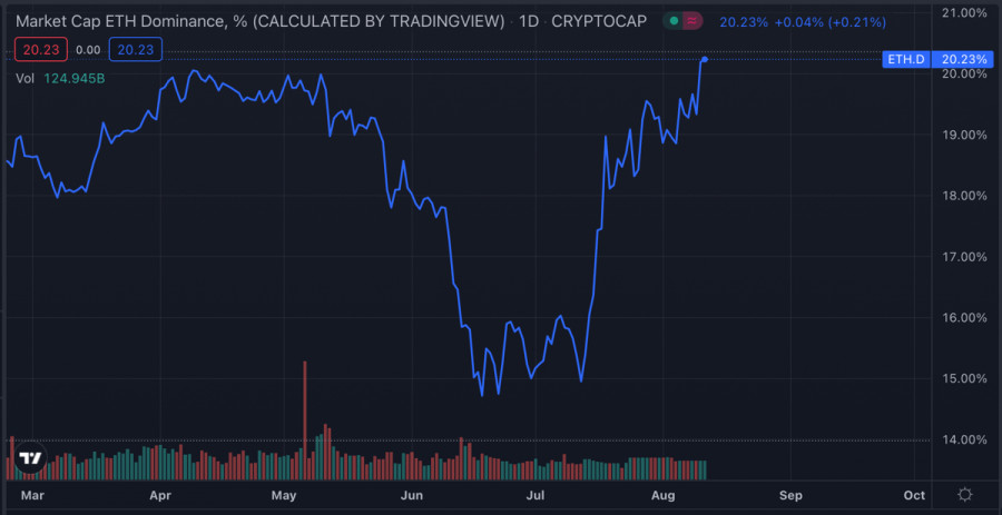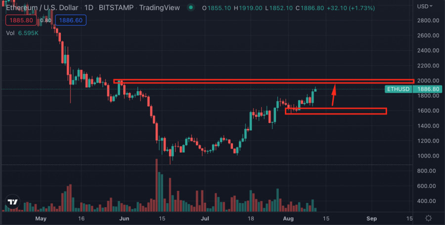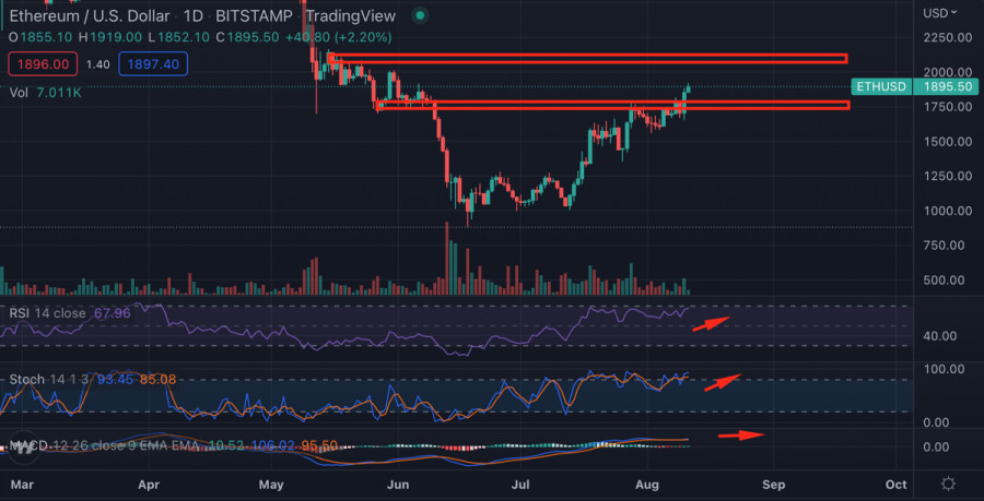 Ethereum закрепился выше $1800: стоит ли ждать штурма $2000 на этой неделе?ИнстаФорекс - Instaforex, 3 года назад Как мы и предполагали, именно Ethereum стал главным бенефициаром фундаментальных позитивных новостей. Криптовалюта воспользовалась всеобщей эйфорией и выросла на 12% за последние сутки. Недельный прирост котировок ETH/USD достиг уровня в 15,5%. Главный альткоин окончательно закрепился выше уровня $1800 и совершил мощный скачок к отметке в $1900. Вполне вероятно, что при сохранении текущей бычьей динамики ETH сумеет достичь уровня в $2000 впервые с мая 2022 года. Ethereum продолжает восходящее движение, пользуясь позитивной статистикой об инфляции, которая упала ниже уровня ожиданий, до 8,5%. Постепенное снижение инфляции в годовом эквиваленте указывает на вероятность свертывания агрессивной монетарной политики уже осенью 2022 года. Для криптовалютного рынка это позитивный сигнал, так как после ужесточения начнется откат к нейтральным позициям. Этот процесс облегчит доступ к ликвидности и, соответственно, поможет зарождению бычьего ралли. Однако в большинстве случаев основную выгоду от смягчения монетарной политики отдают Биткоину. В текущей рыночной ситуации все кардинально поменялось. Bitcoin уходит на второй план, а основной движущей силой рынка криптовалют становится Ethereum. Главный альткоин является главной инвестиционной целью крупных фондов в течение последних месяцев. Это связано с переходом монеты на алгоритм PoS и позитивными изменениями, которые за этим последуют. Другими словами, у эфира есть фундаментальные причины для роста, которые обеспечивают постоянный инвестиционный интерес. Биткоин не может таким похвастаться, а потому растет исключительно на позитивным фундаментальных новостях. Растущий интерес к Ethereum можно проследить по уровню доминирования Биткоина на рынке. Показатель находится в нисходящем тренде, что указывает на интерес инвесторов к другим цифровым монетам. Показатель начал серьезно снижаться в конце июля и вышел на пик падения в августе. Именно за этот период информационный хайп вокруг перехода эфира на PoS достиг максимума. За аналогичный период времени уровень доминирования ETH серьезно вырос и по состоянию на 11 августа достиг 20,24%. Это прямое доказательство перетока инвестиций из BTC в ETH. Это также косвенно свидетельствует о том, что именно главный альткоин станет главной инвестиционной целью рынка на ближайшие недели. Эфир получил макроэкономический позитив вдобавок к грядущему обновлению, что также скажется на бычьем движении цены криптовалюты. Крупнейшие эмитенты стейблкоинов Tether и Circle заявили о полной поддержке перехода ETH на протокол Proof-of-Stake. Также на август запланировано несколько слияний тестнетов, в том числе успешная миграция Goerli на PoS, что должно укрепить фундаментальный позитив в отношении ETH. В техническом плане актив снова достиг уровня перекупленности. Стохастический осциллятор сформировал и реализовал бычье пересечение, из-за чего показатель достиг отметки 100. Индекс относительной силы вплотную приблизился к уровню 80 и сохраняет восходящую направленность, что говорит о росте покупательской активности. Эфир впервые заступил в сильную область сопротивления, и ожидать ее бычьего пробоя с первой попытки не стоит. Вероятнее всего, нас ждет локальная коррекция и небольшой период консолидации перед по