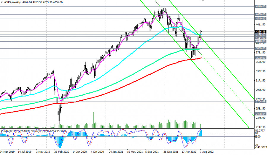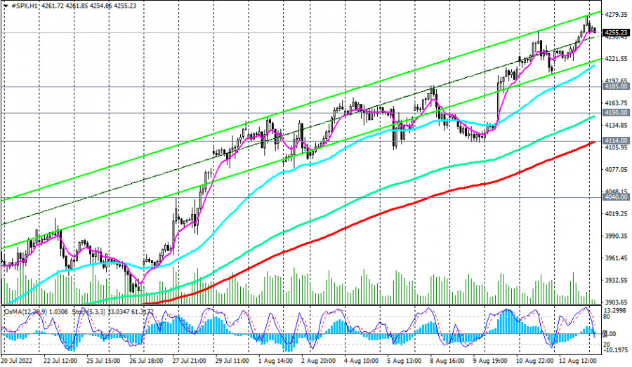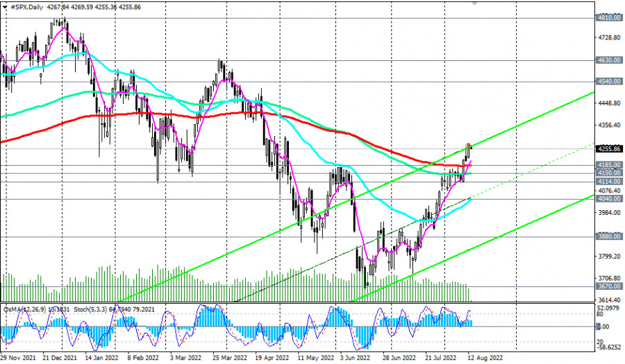 S&P 500: технический анализ и торговые рекомендации на 15.08.2022ИнстаФорекс - Instaforex, 3 года назад Как мы уже отметили в нашем сегодняшнем «Фундаментальном анализе», американский индекс широкого рынка S&P 500 (в торговом терминале он отражается как CFD #SPX) пробил на прошлой неделе ключевой уровень сопротивления 4185.00 (ЕМА200 на дневном графике), поднявшись к 14-недельному максимуму и отметке 4277.00. В данный момент CFD #SPX торгуется вблизи отметки 4255.00, также выше важных уровней поддержки 4114.00 (ЕМА200 на 1-часовом графике), 4040.00 (ЕМА200 на 4-часовом графике, ЕМА50 на дневном графике). Через отметку 4255.00 также проходит верхняя линия восходящего канала на дневном графике. При этом технические индикаторы OsMA и Стохастик на дневном и недельном графиках находятся на стороне покупателей. В текущей ситуации (по крайней мере с технической точки зрения) предпочтительными выглядят длинные позиции, «и пока что необходимо акцентироваться на возможности их открытия». Вероятно, пробой локального максимума 4277.00 станет сигналом к этому. В альтернативном сценарии и после пробоя уровней поддержки 4185.00, 4150.00, 4114.00 S&P 500 вновь направится к ключевому долгосрочному уровню поддержки 3670.00 (ЕМА200 на недельном графике), отделяющего многолетний бычий тренд от медвежьего. Его пробой может окончательно сломать многолетний глобальный бычий тренд S&P 500, да и, пожалуй, всего американского фондового рынка. *) об особенностях торговли индексом S&P 500 см. в статье «S&P500: американский фондовый индекс (характеристики, рекомендации)» Уровни поддержки: 4200.00, 4185.00, 4150.00, 4114.00, 4100.00, 4040.00, 3670.00, 3600.00 Уровни сопротивления: 4277.00, 4300.00, 4400.00, 4540.00, 4630.00, 4810.00