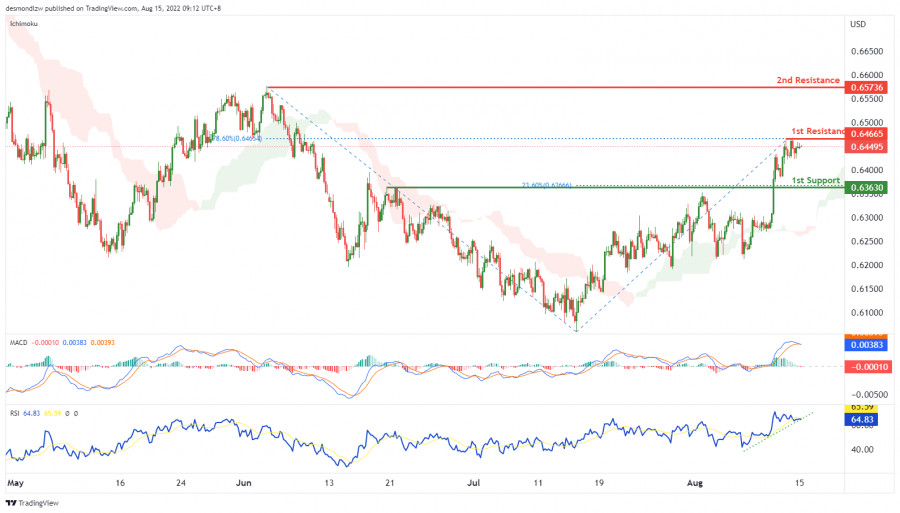 NZD/USD: сохраняется потенциал для дальнейшего роста. Прогноз на 15 августа 2022ИнстаФорекс - Instaforex, 3 года назад На 4-часовом графике пара NZD/USD торгуется над Облаком Ишимоку, а индикатор RSI движется вдоль восходящей линии тренда, что указывает на бычий импульс. Ожидается, что цена может вырасти от 1-го уровня сопротивления 0.64665, соответствующего уровню свинг-хай и 78.6% уровню коррекции Фибоначчи, до 2-го уровня сопротивления 0.65736, который также соответствует уровню свинг-хай. Поскольку гистограммы MACD находятся ниже нулевой отметки, а DIF почти пересекает сигнальную линию, в качестве альтернативы цена может упасть до 1-го уровня поддержки 0.63630, соответствующего 23.6% уровню коррекции Фибоначчи и перекрытию, выступающему в качестве поддержки. Торговая рекомендация Вход: 0.64665 Условия для входа: уровень свинг-хай и уровень коррекции Фибоначчи 78.6% Тейк-профит: 0.65736 Условия для фиксации прибыли: свинг-хай Стоп-лосс: 0.63630 Условия для активации ордера стоп-лосс: 23.6% уровень коррекции Фибоначчи и перекрытие, выступающее в роли поддержки Материал предоставлен компанией InstaForex - www.instaforex.com |