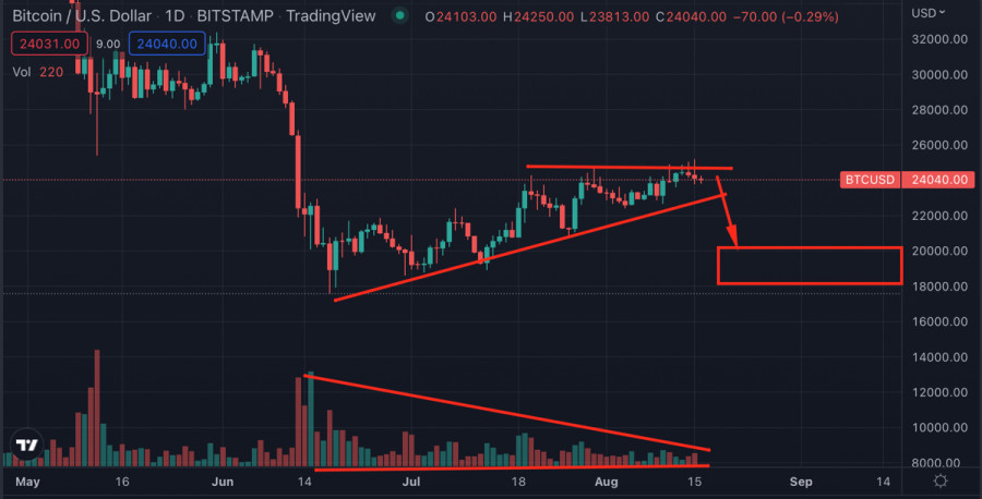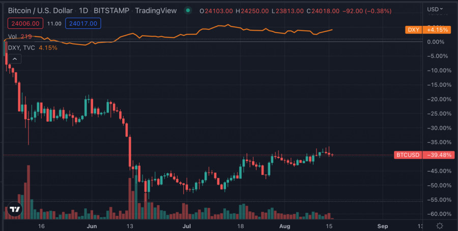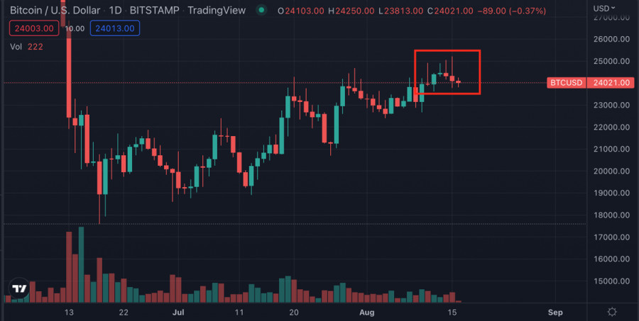 Биткоин потерял бычий запал и начинает снижаться: что будет с криптовалютой дальше?ИнстаФорекс - Instaforex, 3 года назад Судя по ситуации последних дней, Биткоин достиг максимума в рамках реализации бычьего импульса. Цене криптовалюты удалось достичь локального максимума на отметке $25k, однако на этот рубеж актив заходил на падающих объемах. Череда неуверенных свечей "доджи", которая последовала после обновления локального максимума, прямо свидетельствует о несостоятельности Биткоин-быков двигать цену вверх. Причиной этому являются как фундаментальные, так и технические факторы. Начнем с фактором, которые зависят напрямую от криптовалюты. За последнюю неделю бычьи настроения на рынке поутихли, а часть инвесторов и вовсе начали фиксировать прибыль вблизи уровня $25k. Это указывает на краткосрочную веру в актив, а также наличие спекулятивной аудитории и заемных средств. Активные действия краткосрочных инвесторов и позитивные новости, которые сопровождали актив последние две недели, создали иллюзию восходящего движения, основанного на фундаментальных факторах. Однако это не так, и первая причина тому – отток средств из крипто фондов во время обновления Биткоином локального максимума. Это явная дивергенция, свидетельствующая об искусственности роста криптовалюты. Помимо этого, наблюдается стагнация показателя торговой активности. Инвестиционная деятельность остается на уровне $27-$30 миллиардов, что является показателем ниже среднего. В условиях роста цены падение или стагнация объемов суточных торгов указывает на отсутствие фундаментальных факторов для роста. В случае с Биткоином такие факторы временно заменялись позитивом от фундаментальных новостей и активностью краткосрочных инвесторов с большими кредитными плечами. Также важно отметить, что криптовалюта находится под постоянным давлением майнеров, которые продолжают продавать BTC. Текущие темпы накопления не в состоянии поглотить большие объемы в обращении. Главным фундаментальным фактором, указывающим на завершение роста Биткоина, является индекс доллара США. Показатель завершил коррекцию и возобновил восходящее движение, достигнув уровня 106. Позитивная динамика в движении цены DXY наблюдается последние несколько дней, что напрямую связано с падением интереса к BTC. Новость о снижении уровня инфляции оказала гораздо больший позитивный эффект на DXY, чем на Биткоин. А учитывая обратную корреляцию финансовых инструментов, стоит ожидать падения BTC и обновления максимума DXY. Еще одним важным сигналом, который подтверждает отсутствие фундаментальных факторов для роста, является снижение уровня корреляции между Биткоином и фондовыми индексами. SPX успешно закрепился выше $4200 и продолжает восходящее движение. После достижения локального дна, фондовый рынок начал привлекать инвестиции, а индексы обновлять локальные максимумы. Это напрямую влияет на созависимость BTC и фондовых показателей. С одной стороны, это делает Bitcoin более независимым, но в текущей ситуации высокий уровень корреляции мог позволить криптовалюте пробить $25k. С учетом падающих объемов торгов рынок будет опускаться в диапазон $20k-$22k, что собрать ликвидность, необходимую для дальнейшего роста. После формирования локального дна, рынок так и не показал соразмерные объемы торгов, а потому Биткоин буде