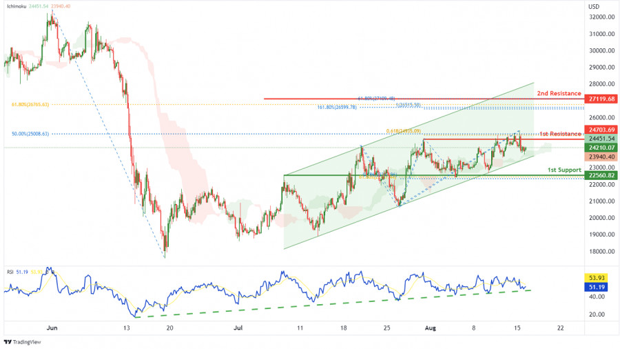 BTC/USD: ожидается усиление бычьего импульса. Прогноз на 16 августа 2022 г.ИнстаФорекс - Instaforex, 3 года назад На 4-часовом графике пара BTC/USD торгуется в рамках восходящего канала, а также выше Облака Ишимоку, а индикатор RSI движется вдоль восходящей линии тренда, что указывает на бычий импульс. По прогнозам, цена вырастет до 1-го уровня сопротивления 24703.69, соответствующего линии сопротивления, 50% уровню коррекции Фибоначчи и 61.8% проекции Фибоначчи. Как только появится подтверждение того, что цена пробила 1-й уровень сопротивления, ожидается, что бычий импульс направит цену ко 2-му уровню сопротивления 27119.68, который соответствует 61.8% уровню коррекции Фибоначчи, -61.8% уровню расширения Фибоначчи, 161.8% уровню расширения Фибоначчи и 100% проекции Фибоначчи. В качестве альтернативы цена может упасть до 1-го уровня поддержки 22560.82, соответствующего линии поддержки, 61.8% уровню коррекции Фибоначчи и 78.6% проекции Фибоначчи. Торговая рекомендация Вход: 24703.69 Условия для входа: линия сопротивления, 50% уровень коррекции Фибоначчи и 61.8% проекция Фибоначчи Тейк-профит: 27119.68 Условия для фиксации прибыли: уровень коррекции Фибоначчи 61.8%, уровень расширения Фибоначчи -61.8%, уровень расширения Фибоначчи 161.8% и проекция Фибоначчи 100% Стоп-лосс: 22560.82 Условия для активации ордера стоп-лосс: линия поддержки, 61.8% уровень коррекции Фибоначчи и 78.6% проекция Фибоначчи Материал предоставлен компанией InstaForex - www.instaforex.com |