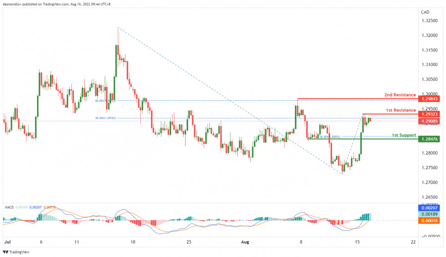 USD/CAD: возможен бычий отскок. Прогноз на 16 августа 2022 г.ИнстаФорекс - Instaforex, 3 года назад На 4-часовом графике индикаторы MACD находятся выше нулевой отметки, что указывает на бычий импульс пары USD/CAD. Ожидается, что цена может вырасти от 1-го уровня сопротивления 1.29323, соответствующего 38.2% уровню коррекции Фибоначчи, до 2-го уровня сопротивления 1.29843, который соответствует 50% уровню коррекции Фибоначчи и уровню свинг-хай. В качестве альтернативы цена может упасть до 1-го уровня поддержки 1.28476, соответствующего 38.2% уровню коррекции Фибоначчи и перекрытию, выступающему в качестве поддержки. Торговая рекомендация Вход: 1.29323 Условия для входа: 38.2% уровень коррекции Фибоначчи Тейк-профит: 1.29843 Условия для фиксации прибыли: 50% уровень коррекции Фибоначчи и уровень свинг-хай Стоп-лосс: 1.28476 Условия для фиксации прибыли стоп-лосс: 38.2% уровень коррекции Фибоначчи и перекрытие, выступающее в роли поддержки Материал предоставлен компанией InstaForex - www.instaforex.com |
