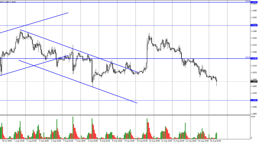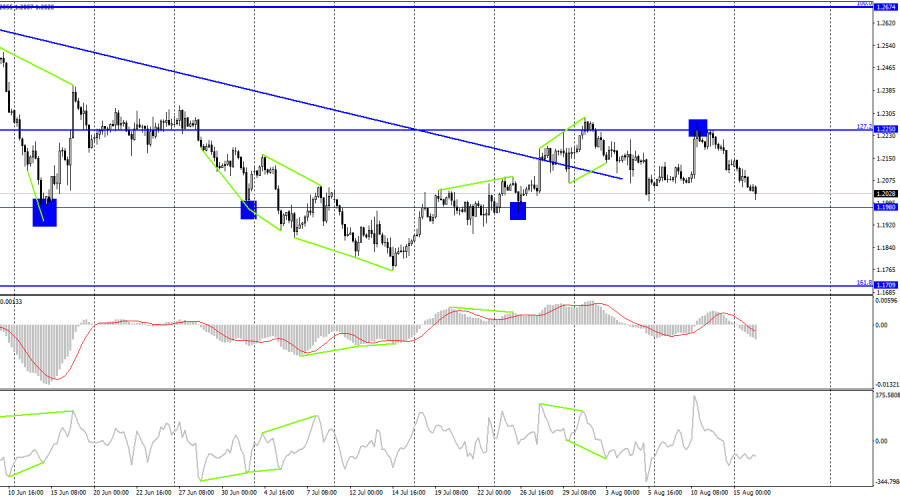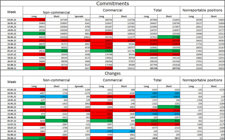 Добрый день, уважаемые трейдеры! На часовом графике пара GBP/USD в понедельник продолжала процесс падения, чем занимается и сегодня, во вторник. После закрепления курса пары под уровнем 523,6% - 1,2146 падение может продолжаться в направлении уровня 1,1933. В то же время информационный фон на этой неделе может сильно повлиять на настроение трейдеров, а начать он свое влияние мог уже сегодня. Утром в Великобритании вышла первая порция отчетов. Уровень безработицы в июне не изменился и составил 3,8%. Количество заявок на пособия по безработице снизилось на 10,5 тысячи, а заработные платы выросли на 5,1%, что чуть выше ожиданий трейдеров. Все три отчета были очень близки к тем значениям, которые ожидались, поэтому у британца не было дополнительных причин ни для падения, ни для роста. Однако последние три дня фунт только и делал, что падал. Ситуация, безусловно, может измениться в любой момент, но пока что я могу констатировать только падение. Сегодня информационный фон никакого влияния на настроение трейдеров не оказал. Однако завтра ситуация может быть уже иной. Утром станет известен уровень инфляции в июле. Напомню, что в июне она составила 9,4%, а ожидания трейдеров по июлю составляют не менее 9,8%. Вероятнее всего, эти ожидания будут оправданы, но реакция рынка на очередной рост инфляции может быть неочевидной и неожиданной. Показатель инфляции сейчас интересует трейдеров только лишь в разрезе будущих решений, которые примутся Банком Англии на следующих заседаниях. Однако Банк Англии уже шесть раз подряд повысил процентную ставку и не объявил, до какого значения он готов ее повышать. Зато Эндрю Бейли объявил, что ждет рецессии во второй половине 2022 года. А рецессия – это падение экономики. А падение экономики началось уже во втором квартале (-0,1% ВВП). Высокая же ставка будет оказывать дополнительное давление на экономику. И сейчас абсолютно непонятно, что поставят на первое место Бейли и его коллеги: дальнейшую борьбу с инфляцией или спасения экономики от рецессии? На 4-часовом графике пара выполнила отбой от уровня коррекции 127,2% - 1,2250 и продолжает процесс падения в направлении уровня 1,1980. Назревающих дивергенций сегодня не наблюдается ни у одного индикатора. Отбой котировок от уровня 1,1980 сработает в пользу британца и некоторого роста в направлении уровня 1,2250, а закрытие под 1,1980 повысит вероятность дальнейшего падения в направлении следующего уровня Фибо 161,8% - 1,1709. Отчет Commitments of Traders (COT):