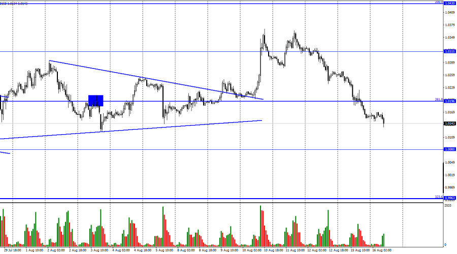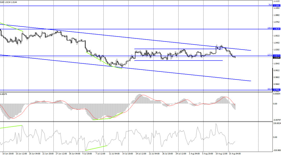 EUR/USD. 16 августа. Если рецессия в США уже началась, то почему доллар растет?ИнстаФорекс - Instaforex, 3 года назад Добрый день, уважаемые трейдеры! Пара EUR/USD в понедельник продолжала процесс падения и выполнила закрепление под уровнем коррекции 261,8% - 1,0196. Продолжается падение котировок и сегодня, уже в направлении уровня 1,0080. Всего лишь за три неполных дня европейская валюта упала более чем на 200 пунктов. И это при том, что информационного фона не было никакого ни вчера, ни сегодня. Как я уже говорил в понедельник, огромное количество внимания сейчас уделяется теме возможной рецессии в США и Евросоюзе. Многие экономисты считают, что рецессия в Америке уже началась, что подтверждают данные по ВВП за первый и второй квартал. Некоторые называют это явление «технической рецессией». В ФРС считают, что речь идет не о рецессии, а о небольшом спаде после периода сильного роста экономики. Смысл остается один и тот же: американская экономика сокращается два квартала подряд, а называть этот процесс можно как угодно. Но если американская экономика сокращается, а европейская растет, то почему евро находится на минимальных за 20 лет значениях и не может показать даже приличный рост? С моей точки зрения, вопрос рецессии не слишком важен сейчас для трейдеров. Европейская экономика тоже находится на грани рецессии, как уверяют экономисты, и обязательно в нее скатится, как только ЕЦБ начнет повышать процентную ставку. Таким образом, обе экономики находятся в приблизительно равных условиях. А разница заключается как раз в действиях и планах центральных банков США и Евросоюза. ФРС продолжает повышать процентную ставку, а ЕЦБ – продолжает «ждать подходящего момента», наблюдая как инфляция растет. Разница между значениями ставок в США и ЕС растет с каждым месяцем становится все больше и больше, а это, напомню, весьма серьезный фактор для трейдеров в пользу покупок валюты США. И он является таковым уже полгода, с того момента как ФРС впервые подняла свою ставку. С моей точки зрения, это наиболее важный фактор для трейдеров, и американский доллар может продолжать рост. На 4-часовом графике пара выполнила разворот в пользу валюты США и закрепление под уровнем коррекции 127,2% - 1,0173. Паре так и не удалось выполнить закрепление над нисходящим трендовым коридором, который продолжает характеризовать текущее настроение трейдеров как «медвежье». Таким образом, процесс падения может быть продолжен в направлении уровня Фибо 161,8% - 0,9581. Отчет Commitments of Traders (COT):