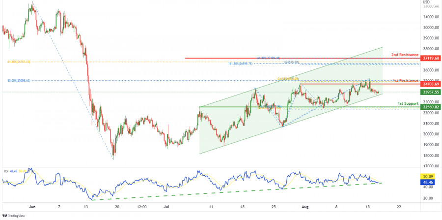 BTC/USD: ожидается дальнейшее развитие восходящей тенденции. Прогноз на 17 августа 2022ИнстаФорекс - Instaforex, 3 года назад На 4-часовом графике пара BTC/USD торгуется в рамках бычьего канала и выше Облака Ишимоку, а индикатор RSI движется вдоль восходящей линии тренда, что указывает на бычий импульс. По прогнозам, цена вырастет до 1-го уровня сопротивления 24703.69, соответствующего линии сопротивления, 50% уровню коррекции Фибоначчи и 61.8% проекции Фибоначчи. Как только появится подтверждение того, что цена пробила 1-й уровень сопротивления, ожидается, что бычий импульс направит пару ко 2-му уровню сопротивления 27119.68, который соответствует 61.8% уровню коррекции Фибоначчи, -61.8% уровню расширения Фибоначчи, 161.8% уровню расширения Фибоначчи и 100% проекции Фибоначчи. В качестве альтернативы цена может упасть до 1-го уровня поддержки 22560.82, соответствующего линии поддержки, 61.8% уровню коррекции Фибоначчи и 78.6% проекции Фибоначчи. Торговая рекомендация Вход: 24703.69 Условия для входа: линия сопротивления, 50% уровень коррекции Фибоначчи и 61.8% проекция Фибоначчи Тейк-профит: 27119.68 Условия для фиксации прибыли: уровень коррекции Фибоначчи 61.8%, уровень расширения Фибоначчи -61.8%, уровень расширения Фибоначчи 161.8% и проекция Фибоначчи 100% Стоп-лосс: 22560.82 Условия для активации ордера стоп-лосс: линия поддержки, уровень коррекции Фибоначчи 61.8% и проекция Фибоначчи 78.6% Материал предоставлен компанией InstaForex - www.instaforex.com |