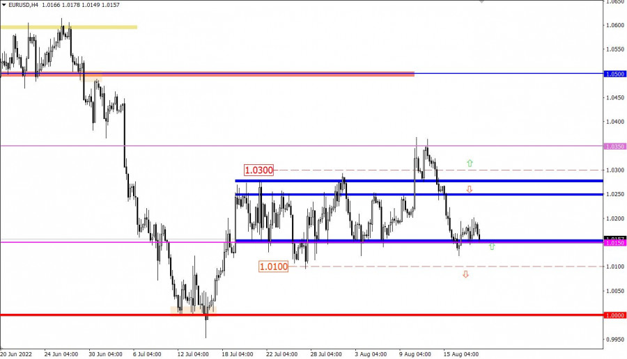 Фунт стерлингов после публикации статистических данных перешел к поэтапному снижению. По Европе дела обстоят не лучше, статуправление Евросоюза пересмотрело в худшую сторону вторую оценку ВВП за 2-й квартал 2022 года. Экономика еврозоны в апреле-июне выросла на 0,6% по сравнению с предыдущим кварталом и на 3,9% в годовом выражении, свидетельствуют пересмотренные данные. Ранее сообщалось о повышении ВВП соответственно на 0,7% и 4%. Евро оказался под давлением продавцов. В период американской торговой сессии были опубликованы данные по розничным продажам в Соединенных Штатах, темпы роста которых ускорился с 8,73% до 10,02%. Стоит учесть, что прогнозировали их замедление до 8,1%. Расхождение ожиданий усилило долларовые позиции на рынке. В период, когда европейская сессия была уже закрыта, а западные трейдеры находились в активной фазе, опубликовали протокол FOMC. Исходя из полученной информации, регулятор, а точнее, его члены имеют разнонаправленное мнение о происходящем в экономике. С одной стороны, всё будут делать для снижения инфляции, с другой стороны, они уже переживают за снижение экономического роста. С учетом текущего поднятия ставок имеется риск более болезненного удара по экономике. Основные тезисы протокола FOMC: • Все участники заседания (26-27 июля) согласились с целесообразностью повешения ставки на 75 базисных пунктов • Чиновники ожидают "продолжающегося повышения" ставки по федеральным фондам • Чиновники ФРС в какой-то момент увидели замедление темпов экономики из-за повышения ставок • Официальные лица говорят, что переход к ограничительной политике "необходим" для выполнения двойного мандата • Основной эффект ужесточения еще предстоит ощутить • Участники "подчеркнули", что замедление спроса "сыграет важную роль" в снижении инфляции • Некоторые официальные лица считают целесообразным сохранить ограничительную политику "на некоторое время" • Прогноз для экономики "заметно слабее" в июле, чем в июне • Уровень безработицы начнет расти во 2 полугодии 2022 года Оригинальный документ протокола FOMC доступен по ссылке Разбор торговых графиков от 17 августаВалютная пара EURUSD замедлила нисходящий ход в пределах уровня поддержки 1.0150. Вследствие чего возник откат примерно на 50 пунктов, а после застой. Валютная пара GBPUSD завершила стадию отката в пределах уровня 1.2150, где возник рост объема коротких позиций. В итоге долларовые позиции вновь стали актуальны на рынке, что привело к их полному восстановлению относительно оката. Экономический календарь на 18 августаСегодня будут опубликованы данные по инфляции в Европе, где ожидают ее рост с 8,6% до 8,9%. Стоит учесть, что это итоговые данные, и если они совпадут, то реакции на рынке не возникнет. В случае расхождения либо более сильного роста инфляции на рынке могут возникнуть спекуляции. Говоря простыми словами, рост инфляции толкает ЕЦБ к более жестким мерам. Это означает, что процентные ставки продолжат расти. В период американской торговой сессии опубликованы еженедельные данные по заявкам на пособие безработице в Соединенных Штатах, где прогнозируют дальнейший рост их объема. Это негативный фактор для рынка труда США, что может сказаться на долларовых позициях. Детали статистических данных: Объем повторных заявок на пособие может увеличиться с 1 428 тыс. до 1 438 тыс. Объем первичных заявок н