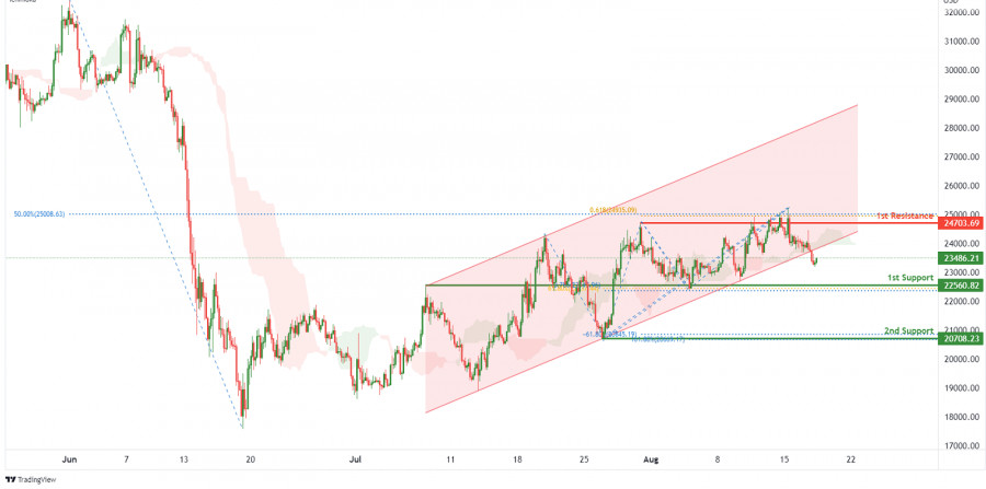 BTC/USD: ожидается формирование медвежьего импульса. Прогноз на 18 августа 2022ИнстаФорекс - Instaforex, 3 года назад На 4-часовом графике пара BTC/USD вырвалась из бычьего канала и сейчас движется ниже индикатора Ишимоку, что указывает на медвежий импульс. По прогнозам, цена упадет до 1-го уровня поддержки 22560.82, соответствующего линии поддержки, 61.8% уровню коррекции Фибоначчи и 78.6% проекции Фибоначчи. Как только цена пробьет 1-й уровень поддержки, ожидается, что медвежий импульс направит пару ко 2-му уровню поддержки 20708.23, соответствующему уровням расширения Фибоначчи -61.8% и 161.8%, а также уровню свинг-лоу, выступающему в роли поддержки. В качестве альтернативы цена может укрепиться до 1-го уровня сопротивления 24703.69, который соответствует линии сопротивления, 50% уровню коррекции Фибоначчи и 61.8% проекции Фибоначчи. Торговая рекомендация Вход: 22560.82 Условия для входа: линия поддержки, уровень коррекции Фибоначчи 61.8% и проекция Фибоначчи 78.6% Тейк-профит: 20708.23 Условия для фиксации прибыли: уровень расширения Фибоначчи -61.8%, уровень расширения Фибоначчи 161.8% и уровень свинг-лоу, выступающий в качестве поддержки Стоп-лосс: 24703.69 Условия для активации ордера стоп-лосс: линия сопротивления, 50% уровень коррекции Фибоначчи и 61.8% проекция Фибоначчи Материал предоставлен компанией InstaForex - www.instaforex.com |
