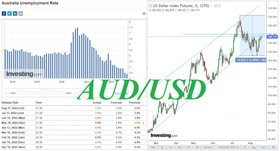 AUD/USD: безработица в Австралии снизилась, AUD – тожеИнстаФорекс - Instaforex, 3 года назад Как сообщило сегодня утром Австралийское бюро статистики, уровень безработицы в июле снизился до 3,4% (против прогноза 3,5% и значения 3,5% в июне). Это, безусловно, сильный показатель, однако он не смог оказать существенной поддержки австралийскому доллару, в паре с американским долларом он продолжил снижаться: не оправдавший прогнозов показатель занятости негативно сказался австралийской валюте. Согласно представленным данным, уровень занятости в Австралии в июле снизился (на -40.9 тыс.), хотя прогноз предполагал рост на +25.0 тыс. после предыдущего роста на +88.4 тыс. в июне. В среду был опубликован протокол августовского заседания Резервного банка Австралии по монетарной политике, из которого следует, что руководство банка настроено на «дальнейшие шаги в процессе нормализации монетарных условий в ближайшие месяцы, но не находится на заранее намеченном пути" (см. также Инструменты фундаментального анализа: Динамика рынка труда и Кредитно-денежная политика центрального банка). Члены совета директоров РБА также отметили, что «пик инфляции придется на 2022 год», а далее «инфляция снова снизится до верхней границы целевого диапазона от 2 до 3 процентов к концу 2024 года». Члены руководства ЦБ Австралии также отметили «риски для глобальных перспектив, которые являются понижательными», а основным источником неопределенности для прогноза остается «динамика расходов домашних хозяйств». Экономисты и наблюдатели отмечают, что в целом протокол может быть охарактеризован как "голубиный". И теперь, после сегодняшней публикации отчета по рынку труда Австралии, многие участники рынка закладывают в цены вероятность того, что РБА снизит ставку на 25 б.п. в сентябре или пока поставит этот процесс на паузу, а не повысит процентную ставку, как считалось ранее. В то же время ФРС нацелена на то, чтобы продолжать агрессивное повышение ставок, что в конечном итоге негативно скажется на росте мировой экономики. Ужесточение же финансовых условий и, как следствие, замедление экономического роста негативно отражается на сырьевых валютах, к которым относится AUD. Таким образом, на фоне продолжающегося повышения процентных ставок ФРС и более сдержанного подхода РБА к данному процессу, следует ожидать дальнейшего снижения пары AUD/USD. На момент публикации данной статьи она торгуется вблизи отметки 0.6927, оставаясь в зоне медвежьего рынка ниже ключевых уровней сопротивления 0.7130, 0.7280 и сохраняя склонность к дальнейшему снижению (подробнее см. в «AUD/USD: технический анализ и торговые рекомендации на 18.08.2022»). Теперь важные экономические индикаторы по Австралии будут опубликованы лишь в конце августа, и в динамике AUD/USD следует ориентироваться на динамику американского доллара, а он сегодня вновь укрепляется, в то время как индекс доллара DXY растет 5-й день подряд. На момент публикации данной статьи фьючерсы DXY торгуются в непосредственной близости от локального уровня сопротивления 107.00. Его пробой обусловит возврат DXY в восходящий канал на дневном графике DXY. Его верхняя граница проходит выше отметки 110.00. После пробоя локального многомесячного максимума 109.14, достигнутого в середине июля, отметка 110.00 станет следующей целью роста DXY. *) об особенностях торговли парой AUD/USD см. в статье AUD/USD: валю