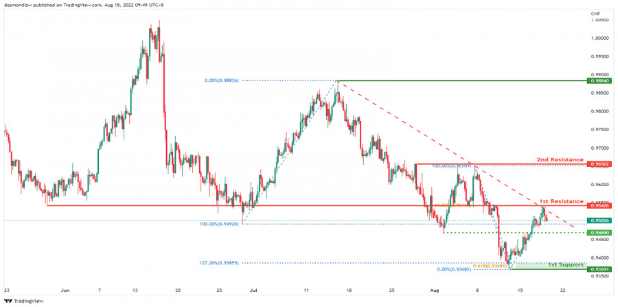 USD/CHF: ожидается усиление медвежьего импульса. Прогноз на 18 августа 2022ИнстаФорекс - Instaforex, 3 года назад На 4-часовом графике пара USD/CHF движется в нисходящем направлении ниже индикатора Облако Ишимоку, что указывает на возможное усиление медвежьего импульса. В данный момент цена тестирует 61.8% уровень коррекции Фибоначчи. Ожидается, что пара может укрепиться, чтобы снова протестировать 1-й уровень сопротивления 0.9542. Если медвежий импульс сохранится, цена откатится до промежуточного уровня поддержки 0.9468, соответствующего предыдущему уровню свинг-лоу, и затем направится до 1-го уровня поддержки 0.9369, который соответствует 61.8% проекции Фибоначчи и 127.2% уровню расширения Фибоначчи. Торговая рекомендация Вход: 0.9542 Условия для входа: откат и уровень коррекции Фибоначчи 61.8% Тейк-профит: 0.9369 Условия для фиксации прибыли: уровень свинг-лоу, выступающий в качестве поддержки, и проекция Фибоначчи 61.8% Стоп-лосс: 0.9656 Условия для активации ордера стоп-лосс: предыдущие уровни свинг-хай Материал предоставлен компанией InstaForex - www.instaforex.com |