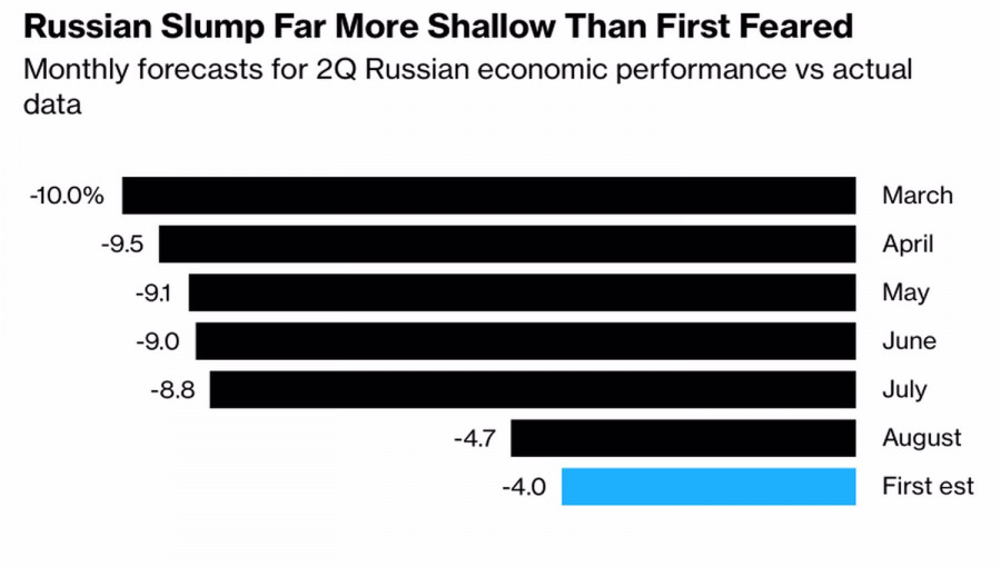 Рубль угрозами не запугаешьИнстаФорекс - Instaforex, 3 года назад На Forex, как в океане: то буря, то штиль. Тренды сменяются консолидациями, консолидации уступают место новым тенденциям. После диких колебаний USDRUB в феврале-июне, когда пара то взлетала к рекордным максимумам, то падала на 7-летнее дно, страсти поутихли. Волатильность рубля существенно снизилась, и теперь он растет в преддверии налогового периода, когда экспортерам необходимо конвертировать валютную выручку для исполнения фискальной дисциплины, и падает, как только этот период заканчивается. Колебания USDRUB в узком коридоре 59-62 не могут нравиться властям. Правительство хотело бы увидеть доллар США по 70-80, и для этого пугает инвесторов возвращением бюджетного правила о передаче сверхдоходов от продажи нефти в Фонд национального благосостояния, для чего требуется покупать иностранную валюту. Кроме того, Кремль постепенно ослабляет контроль за движением капитала, в том числе допускает к торгам на Московской бирже инвесторов из дружественных стран и конвертирует глобальные депозитарные расписки в акции. Центробанк же рисует мрачные перспективы для отечественной экономики. Увы, но все эти меры к росту USDRUB не приводят. Во втором квартале российский ВВП сократился на 4%, вернувшись к уровням, имевшим место в 2018. Таким образом, вооруженный конфликт на Украине отбросил экономику на четыре года назад. Однако предполагалось, что негативные эффекты от западных санкций окажутся куда более существенными. Так в марте в прогнозах фигурировала цифра -10%. Прогнозы и фактические данные по экономике России Банк России является чуть не главным пессимистом при оценке судьбы экономики. По его мнению, в третьем квартале она просядет на 7%, в четвертом – еще больше. Для сравнения, JP Morgan и Citigroup ожидают сокращения на 3,5% по итогам 2022. Эльвира Набиуллина и ее коллеги рассчитывают на возвращение ВВП к прежним темпам роста в 1,5-2,5% только в 2025. В отчет включен и так называемый рискованный сценарий, при котором глобальные экономические условия еще больше ухудшатся, а экспорт попадет под дополнительные санкции. В итоге экономика попадет даже в более глубокую яму, чем во время мирового кризиса 2008-2009. Угрозы по поводу возвращения бюджетного правила пока оставляют «медведей» по USDRUB равнодушными. Информация о замене евро и долларов США в Фонде национального благосостояния китайским юанем, индийской рупией и турецкой лирой вызывают серьезный скептицизм. Повышенная волатильность этих валют заставляет беспокоиться за судьбу фонда. Поддержку рублю оказывает исследование МЭА, согласно которому добыча нефти в России сократилась лишь на 310 тыс. б/с, или 3%, с момента начала вооруженного конфликта на Украине, экспорт – на 580 тыс. б/с. При этом Москва заработала на продаже черного золота $21 млрд в июне и $19 млрд в июле. Технически на дневном графике USDRUB продолжается консолидация. Рост пары в направлении 62,1, 63,1 и 65 используем для продаж, падение к 59,3, 57,7 и 56,4 – для покупок. Материал предоставлен компанией InstaForex - www.instaforex.com |