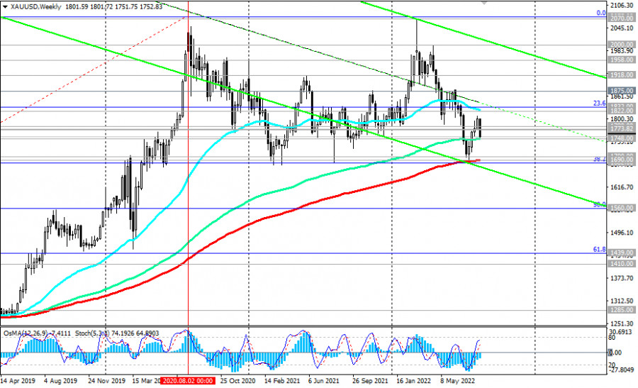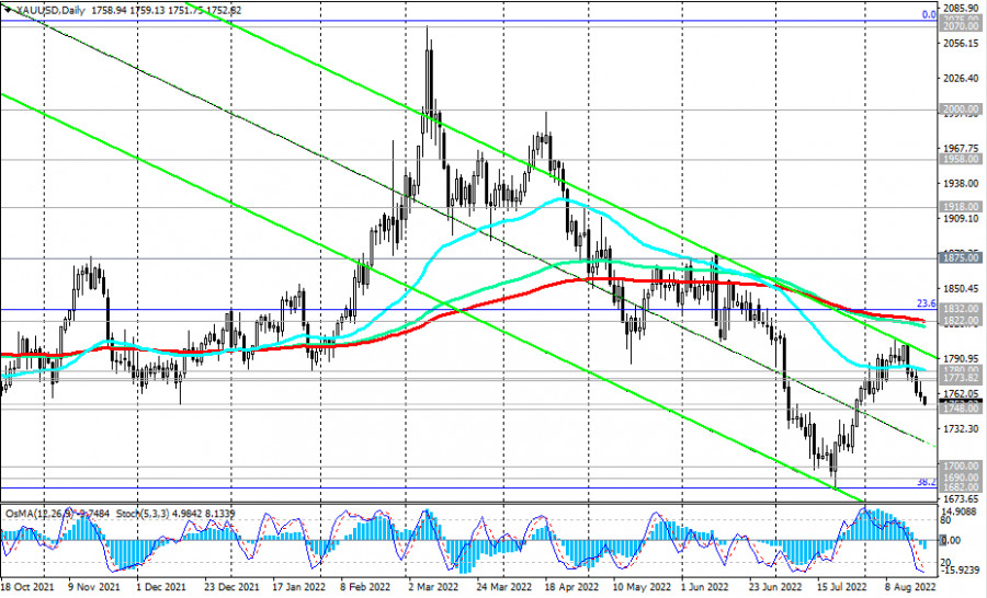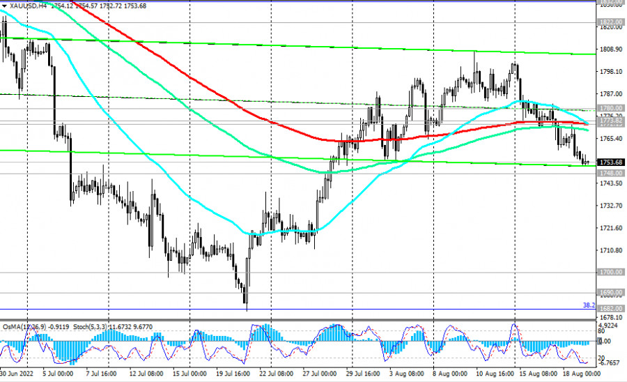 XAU/USD: технический анализ и торговые рекомендации на 19.08.2022ИнстаФорекс - Instaforex, 3 года назад Как мы отметили в нашем сегодняшнем «Фундаментальном анализе», золото «уступает свою роль защитного актива доллару», а пара XAU/USD снижается сегодня 5-й день подряд. На момент публикации данной статьи она торгуется вблизи отметки 1753.00, в непосредственной близости от сильного уровня поддержки 1748.00 (ЕМА144 на недельном графике). Учитывая долгосрочный восходящий тренд XAU/USD, логично предположить отбой вблизи данного уровня поддержки. В случае же его пробоя целью становится ключевой уровень поддержки 1690.00 (ЕМА200 на недельном графике), пробой которого обусловит выход XAU/USD в зону долгосрочного медвежьего рынка. Если же вблизи текущих отметок и уровня поддержки 1748.00 все же произойдет отбой, то сигналом для возобновления длинных позиций станет пробой важных уровней сопротивления 1772.00 (ЕМА200 на 4-часовом графике), 1773.00 (ЕМА200 на 1-часовом графике), 1780.00 (ЕМА50 на дневном графике). В этом случае возможен ретест «круглого» уровня сопротивления 1800.00, который вплоть до начала 20222 года долгое время оставался своего рода «линией баланса» пары. Пробой ключевого уровня сопротивления 1822.00 (ЕМА200 на дневном графике) подтвердит сценарий возобновления долгосрочного бычьего тренда XAU/USD. *) об особенностях торговли XAU/USD см. также XAU/USD: валютная пара (характеристики, рекомендации). Уровни поддержки: 1748.00, 1700.00, 1690.00, 1682.00, 1670.00 Уровни сопротивления: 1772.00, 1773.00, 1780.00, 1800.00, 1822.00, 1832.00, 1875.00