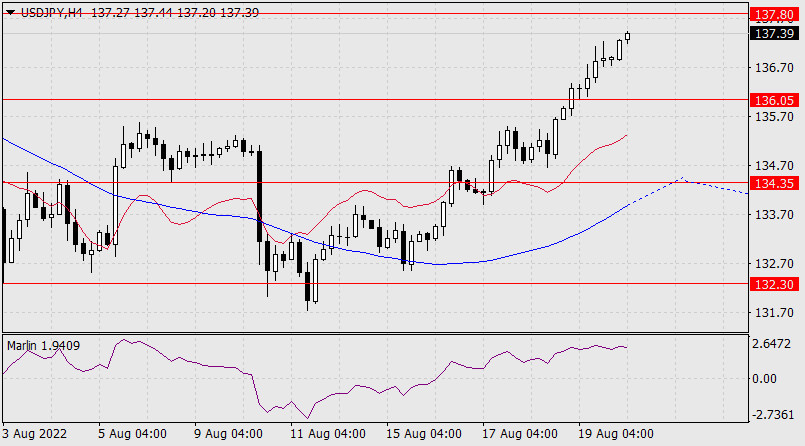 Прогноз по USD/JPY на 22 августа 2022 годаИнстаФорекс - Instaforex, 3 года назад Доллар продолжает наступать на японскую йену вот уже восьмую сессию подряд. Котировка пары USD/JPY уже борется с сопротивлением индикаторной линии Крузенштерна дневного масштаба, выше неё целевой уровень 137.80, образованный вложенной линией ценового канала месячного таймфрейма. Сигнальная линия осциллятора Марлин замедляет рост и это наводит на мысль о готовящейся коррекции, так как весь этот рост доллара происходит на фоне снижения фондового рынка. В пятницу S&P500 потерял 1,29%. Очень может быть, что вскоре цена развернётся в коррекцию на новой волне бегства из риска.