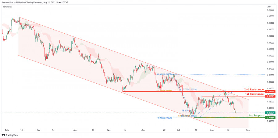 EUR/USD: ожидается усиление медвежьего импульса. Прогноз на 22 августа 2022ИнстаФорекс - Instaforex, 3 года назад На 4-часовом графике пара EUR/USD пробила восходящий тренд и сейчас торгуется ниже индикатора Облако Ишимоку, что указывает на медвежий импульс. Цена снижается к 1-му уровню поддержки 0.9955, соответствующему проекции Фибоначчи 61.8%. В качестве альтернативы цена может откатиться, чтобы протестировать 1-й уровень сопротивления 1.0282, который соответствует предыдущему уровню свинг-хай, а затем 2-й уровень сопротивления 1.0353, соответствующий 61.8% уровню коррекции Фибоначчи и уровню свинг-хай. Торговая рекомендация Вход: 1.003 Условия для входа: откат Тейк-профит: 0.9955 Условия для фиксации прибыли: уровень свинг-лоу, выступающий в качестве поддержки, и проекция Фибоначчи 61.8% Стоп-лосс: 1.011 Условия для активации ордера стоп-лосс: предыдущий уровень свинг-лоу Материал предоставлен компанией InstaForex - www.instaforex.com |