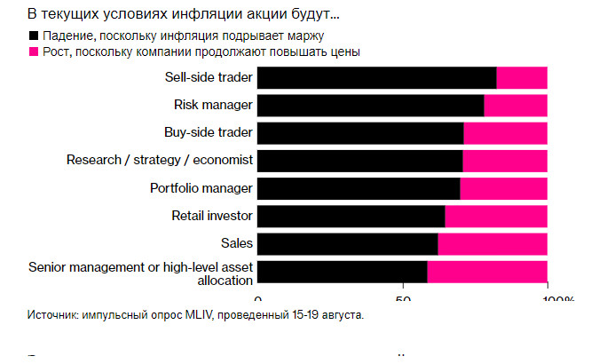 MLIV Pulse - акции и облигации снова упадутИнстаФорекс - Instaforex, 3 года назад Согласно последнему опросу MLIV Pulse, акции и облигации снова упадут, хотя инфляция, вероятно, достигла пика, поскольку повышение ставок вновь пробудит великую распродажу 2022 года. В преддверии симпозиума в Джексон-Хоул, который состоится позднее на этой неделе, 68% респондентов считают, что самая дестабилизирующая эпоха ценового давления за последние десятилетия подрывает прибыль корпораций и ведет к снижению акций. Большинство из более чем 900 участников, в число которых входят стратеги и дейтрейдеры, считают, что инфляция достигла максимума. Тем не менее колоссальные 84% говорят, что центральному банку под руководством Джерома Пауэлла может потребоваться два года или больше, чтобы снизить его до официальной долгосрочной цели в 2%. Тем временем американские потребители сократят расходы, а безработица превысит 4%. Все эти медвежьи настроения подчеркивают глубокий скептицизм инвесторов перед лицом неожиданного восстановления акций на 7 триллионов долларов в последнее время. В то время как акции упали на прошлой неделе, S & P 500 все же сократил свои потери в 2022 году до 11% против снижения на 23% в середине июня. Фьючерсы на американские акции открыли неделю снижением на азиатских торгах. "Это ловушка медвежьего рынка, - сказала в интервью Виктория Грин, партнер-основатель G Squared Private Wealth. - Даже если инфляция действительно будет устойчиво снижаться, может пройти некоторое время, прежде чем цены действительно значительно снизятся". Результаты опроса создают проблемы для покупателей, которые возобновили падение после ужасного первого полугодия, вызванного ставками на менее ястребиный цикл ужесточения денежно-кредитной политики, в то время как множество количественных фондов перешли на бычье позиционирование. В свою очередь, акции по всему миру отыграли некоторые из самых серьезных потерь, в то время как доходность 10-летних казначейских облигаций упала примерно до 3% с пика около 3,5% в начале этого года. Респонденты MLIV, со своей стороны, считают, что цены на облигации снова упадут в течение следующего месяца, а у председателя ФРС Пауэлла есть возможность возобновить ястребиные ожидания рынка на собрании на этой неделе в Джексон-Хоул, штат Вайоминг. Фьючерсы на фонды ФРС в настоящее время показывают, что трейдеры делают ставку на то, что центральный банк прекратит повышение ставки после повышения ориентира до 3,7% и начнет сокращать уже в мае 2023 года. Тем не менее даже голуби отступают, а президент ФРБ Миннеаполиса Нил Кашкари рекомендует ставку в 4,4% к концу следующего года. Большинство читателей MLIV, похоже, ближе к медвежьему спектру жарких дебатов на Уолл-Стрит о том, куда движутся акции. По мнению большинства респондентов, поскольку повышенные цены сохраняются, потребители, вероятно, будут покупать меньше в течение следующих шести месяцев. Это соответствует предупреждениям крупнейшего в мире ритейлера Walmart Inc. о том, что стремительный рост инфляции заставляет покупателей платить больше за предметы первой необходимости в ущерб другим дискреционным товарам. Сокращение потребительских расходов приведет к явному снижению прибыли компаний S & P 500, которые также сталкиваются с повышением заработной платы, ростом запасов и продолжающимися проблемами в цепочке поставок в К