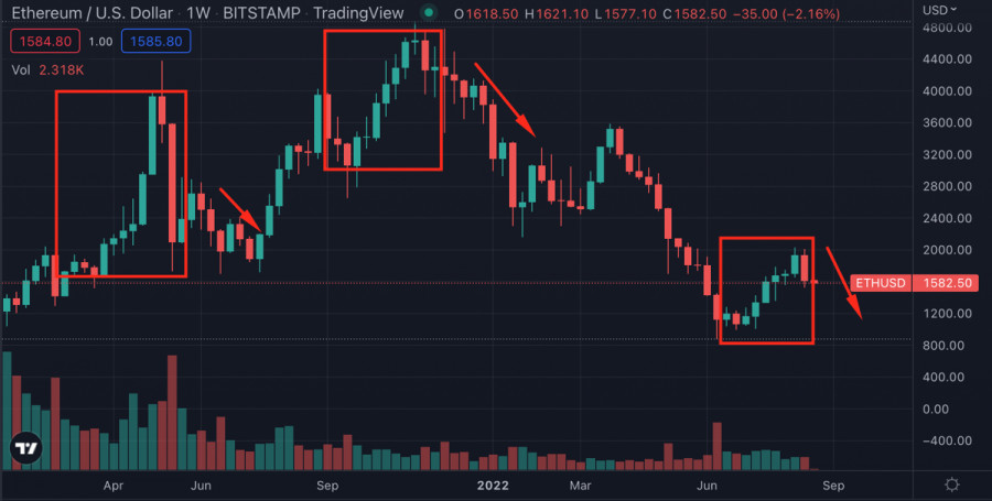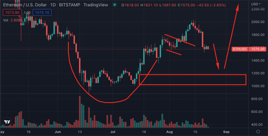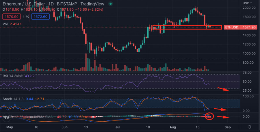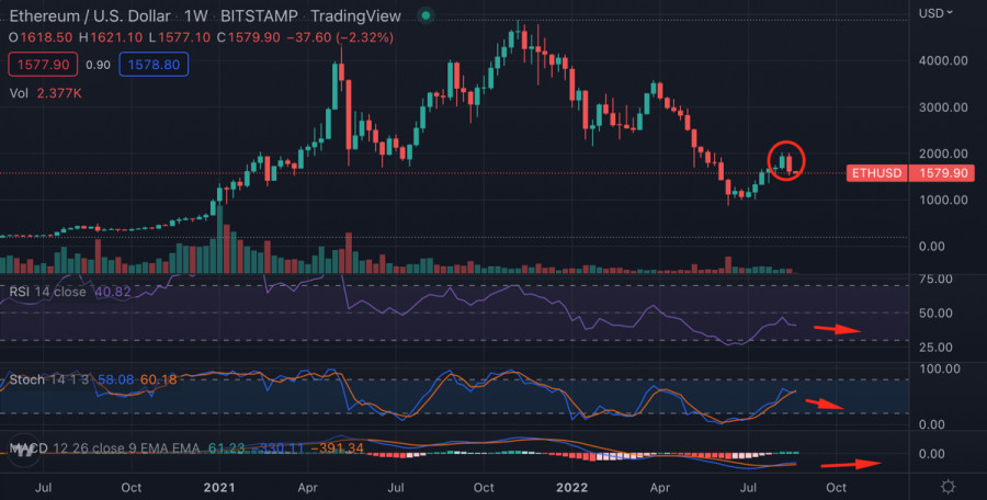 Ethereum снижается на фоне падения Биткоина: чего ждать от актива в ближайшем будущем?ИнстаФорекс - Instaforex, 3 года назад Предыдущая неделя стала для эфириума поворотной, так как монета в моменте достигала уровня $2000, но так и не смогла закрепиться выше. Схожая ситуация происходила с Биткоином, который дотягивался до уровня $25k, но впоследствии начал снижаться. Само по себе достижение важной точки сопротивления влечет за собой активизацию продавцов и локальное снижение цены. Однако в случае с ETH сработала корреляция альткоина с BTC, который осуществил мощное нисходящее пике на фоне негативного фундаментального фона и давления майнеров. При этом утверждать, что именно взаимосвязь с первой криптовалютой вынудили эфириум достичь уровня $1500 будет неверным. В отличие от Биткоина, восходящий тренд эфира имел серьезную фундаментальную подоплеку в виде грядущего обновления Merge. Покупательскую активность вокруг ETH можно проследить на недельном таймфрейме альткоина. Криптовалюта сформировала шесть недельных бычьих свечей кряду, что является отличным результатом для фундаментально подкрепленного восходящего движения. Однако если мы посмотрим на схожие паттерны при бычьем тренде, то увидим, что шесть-семь бычьих свечей это потолок инвестиционного потенциала эфира. Зеленая свеча актива, сформированная по итогам 8-15 августа оказалось шестой, и финальной. Поэтому с фундаментальной точки зрения ETH также претендовал на локальную коррекцию. Важной деталью последующего нисходящего тренда криптовалюты является то, что цена тестирует уровень зарождения восходящего движения. Другими словами, вполне вероятно, что эфириум может отправиться на ретест уровня $1000. На недельном графике мы видим сохранение нисходящей направленности и формирование паттерна "медвежье поглощение". Индекс относительной силы совершил восходящий рывок, но впоследствии был остановлен встречным давлением медведей. Стохастический осциллятор разделил эту судьбу и завершает формирование очередного медвежьего пересечения. При этом MACD продолжает движение по флету, что намекает на импульсивность нисходящих порывов. На дневном графике эфириум также демонстрирует локальную слабость. Технические метрики сползают к нижней границе бычьего канала, а индикатор MACD входит в красную зону, что указывает на увеличение нисходящего потенциала. Стохастический осциллятор вторит недельному таймфрейму и также формирует медвежье пересечение в зоне перекупленности. Индекс относительной силы также движется в нисходящем направлении и пересекает отметку 40. Все эти факторы свидетельствуют о сохранении мощного нисходящего давления, но при этом метрики постепенно входят в зону перекупленности, что говорит о вероятности скорого завершения коррекции. Фундаментально актив продолжает оставаться востребованным у инвесторов. Текущая коррекция, хоть и совпала с болезненным падением Биткоина, имеет оздоровительный характер. Главный альткоин непрерывно рос на протяжении месяца, и основные метрики указывали на необходимость коррекции. Также начало нисходящего движения Ethereum совпало с негативным известием от крупнейшего майнинг-пула Ethermine. В компании заявили, что после перехода на PoS пул разрешит только вывод средств. При этом ни для одного форка Ethermine не будет предлагать свои услуги. Это стал