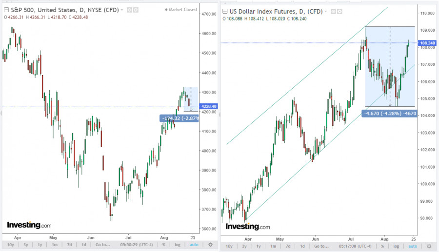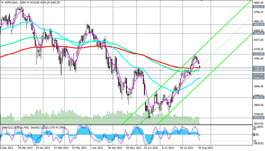 S&P 500: возвращаемся в зону медвежьего рынка?ИнстаФорекс - Instaforex, 3 года назад Завершив минувшую неделю в отрицательной зоне, новая неделя, похоже, также начинается для американского фондового рынка на сильной негативной ноте: сегодняшний торговый день начался гэпом вниз для фьючерсов на основные американские фондовые индексы. Так, индекс широкого рынка S&P 500 (в торговом терминале он отражается как CFD #SPX) на прошлой неделе достиг локального 4-месячного максимума 4324.00, а сегодня резко снизился и тестирует важный уровень поддержки 4185.00 (подробнее см. в «S&P 500: технический анализ и торговые рекомендации на 22.08.2022»). Его пробой ознаменует возврат S&P 500 в зону среднесрочного медвежьего рынка. Как следует из опубликованного в минувшую среду протокола июльского заседания, руководители ФРС согласились с целесообразностью повышения процентной ставки на 75 базисных пунктов. Относительно будущих повышений они решили, что это «будет зависеть от поступающей информации». Возможно также, что на каком-то этапе «будет уместно замедлить темпы повышения". Тем не менее опубликованные протоколы подтвердили намерение руководства ФРС решительно бороться с инфляцией, в том числе последовательно ужесточая монетарную политику. А это – аргумент в пользу дальнейшего укрепления доллара, свидетельствующий также об ужесточении (читай, ухудшении) кредитно-денежных условий для американского бизнеса. Всякий раз, когда ФРС повышала процентную ставку в этом году, ее руководители заявляли, что американская экономика и рынок труда находятся в хорошей форме и выдержат дальнейшее повышение учетной ставки. Однако картина не совсем однозначная, а текущую ситуацию в американской и мировой экономиках нельзя назвать нормальной или обычной на фоне резкого роста цен на энергоносители, уровня инфляции и геополитической напряжённости в мире. Между тем ухудшение рыночных настроений в начале недели придает доллару новый импульс к росту. Так, индекс доллара США, который на прошлой неделе вырос более чем на 2%, пробив также очередной локальный уровень сопротивления 108.00, в начале недели продолжает расти, достигнув к моменту публикации данной статьи нового локального максимума 108.41. Теперь, как мы писали в нашем предыдущем обзоре, «после пробоя локального многомесячного максимума 109.14, достигнутого в середине июля, отметка 110.00 станет следующей целью роста DXY» (через нее проходит верхняя граница данного канала). В четверг начинается ежегодный экономический симпозиум в Джексон-Холе (штат Вайоминг), который организуется и спонсируется ФРС (подробнее см. в Важнейшие экономические события недели 22.08.2022 – 28.08.2022). На симпозиуме представители мировых центральных банков и ученые-экономисты обсуждают вопросы мировой экономики и высказываются в отношении перспектив монетарной политики центральных банков. Вероятно, заявления, сделанные главой ФРС Пауэллом на этом форуме, подтвердят жесткие намерения руководства американского центрального банка побороть высокую инфляцию, что будет способствовать дальнейшему укреплению долларе. Согласно данным CME Group, участники рынка закладывают в цены вероятность повышения ставки на 75 базисных пунктов в сентябре в 48%. Но даже повышение процентной ставки на 0,50% говорит о сохранении жесткого подхода ФРС к циклу ужесточения своей монетарной полит