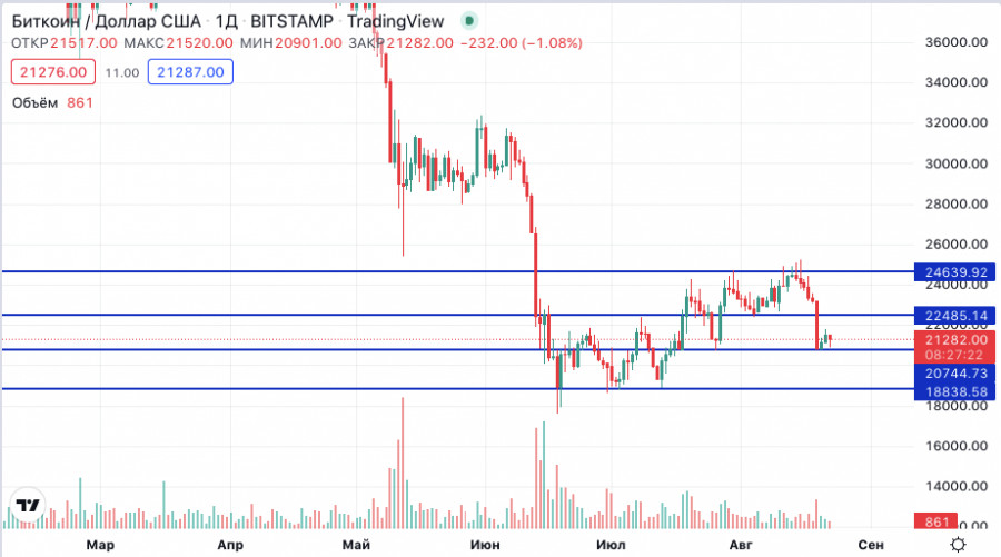 Bitcoin и Джексон Хоул: чего ожидать в преддверие саммитаИнстаФорекс - Instaforex, 3 года назад Пятничное падение Bitcoin более чем на 10% за день было остановлено уровнем поддержки в области 20 700 долларов за монету. Что же, с июньских минимумов и по сей день на дневном графике сформировались четыре уровня. И если сейчас не последует очередного импульса, мы можем увидеть новый этап консолидации в диапазоне 20 700 - 22 400. В этом случае начиная с пятничной дневной свечи может быть отрисован медвежий флаг, а значит, и созданы предпосылки для продолжения движения вниз и падения в область поддержки 18 900. Альтернативным сценарием будет возврат BTCUSD в диапазон 22 400 - 24 400. Биткоин держится лучше, чем остальной крипторынокМедвежий тренд 2022 года по-прежнему толкает цены многих криптовалют ниже ожидаемых отметок. Нисходящая тенденция, которая все еще сохраняется, криптовалюту нанесла миллиардные убытки общей капитализации рынка криптовалют. В разгар криптозимы общая рыночная капитализация упала ниже 1 триллиона долларов, что вызвало массовую панику в криптосообществе. К счастью, она выросла до 1 триллиона долларов, а позже превзошла его. Но теперь, кажется, тенденция снова начала двигаться вниз. За прошлую неделю главная криптовалюта потеряла более 11%. В результате общая капитализация рынка снизилась до уровня, который она уже преодолела. Аналитики задаются вопросом, удержится ли она здесь. Несмотря на обвал цены ВТС в эти несколько дней, другие индикаторы его стоимости кажутся позитивными. Например, доминирование главной криптовалюты на рынке увеличилось на 0,5%. Метрика доминирования на рынке используется для оценки эффективности биткоина и альткоинов. Таким образом, небольшое увеличение уровня доминирования BTC показывает, что главная криптовалюта чувствует себя лучше, чем другие. Это показывает, что в общем на крипторынке не все гладко. Конечно, эта новая неделя может быть благоприятной или неблагоприятной. Но даже при своих потерях цена BTC лучше, чем у многих альткоинов. Несмотря на падение BTC, бегства с рынка нетНа прошлой неделе криптоинвестиционные продукты зарегистрировали незначительный еженедельный отток. Объемы упали до второго самого низкого уровня за год, что свидетельствует о слабом спросе среди институциональных инвесторов в конце лета. Как сообщила CoinShares в понедельник, отток средств из инвестиционных продуктов для цифровых активов составил 8,7 млн долларов за неделю, закончившуюся 21 августа. Инвестиционные продукты в Bitcoin уже третью неделю подряд демонстрируют отток средств на общую сумму 15,3 миллиона долларов. Фонды, напрямую связанные с Solana, также зарегистрировали незначительный отток средств на общую сумму 1,4 миллиона долларов. Между тем Ether и инвестиционные продукты с несколькими активами отметили небольшой еженедельный приток в размере 2,9 млн долларов и 2,7 млн долларов соответственно. В целом еженедельные объемы криптоинвестиционных продуктов составили 1 миллиард долларов, что на 55% ниже среднегодового показателя. CoinShares заявила, что большая часть негативных настроений была сосредоточена вокруг биткоина, который упал на прошлой неделе после отскока от сопротивления в 25 000 долларов. Bitcoin в настоящее время стоит около 21 200 долларов, что ниже его цены реализации или средней цены, по которой в последний раз был куплен оборотный запас