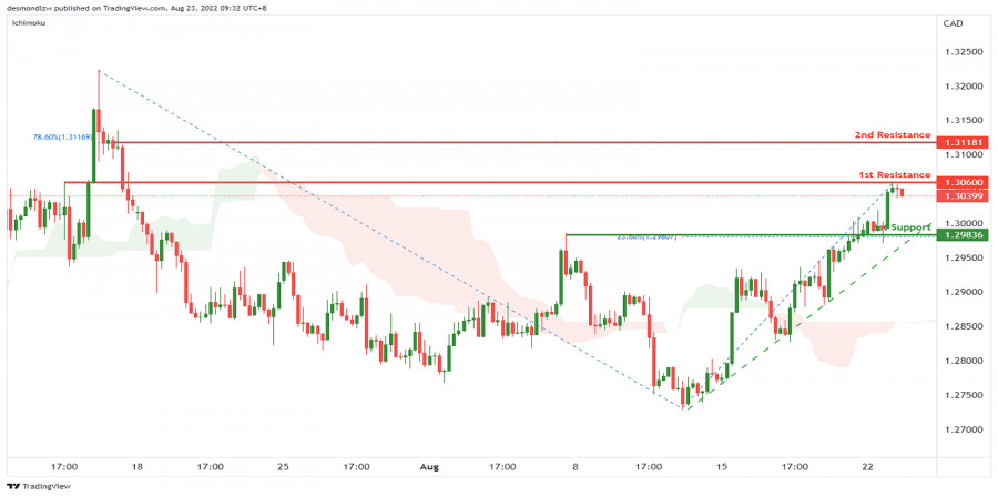 USD/CAD: возможен бычий отскок. Прогноз на 23 августа 2022ИнстаФорекс - Instaforex, 3 года назад На 4-часовом графике пара USD/CAD движется выше Облака Ишимоку и вдоль восходящей линии тренда, что указывает на бычий импульс. Если цена преодолеет 1-й уровень сопротивления 1.30600, соответствующий текущему уровню свинг-хай, пара может подняться до 2-го уровня сопротивления 1.31181, который соответствует 78.6% уровню коррекции Фибоначчи. В качестве альтернативы цена может упасть до 1-го уровня поддержки 1.29836, соответствующего 23.6% уровню коррекции Фибоначчи. Торговая рекомендация Вход: 1.30600 Условия для входа: текущий уровень свинг-хай Тейк-профит: 1.31181 Условия для фиксации прибыли: 78.6% уровень коррекции Фибоначчи Стоп-лосс: 1.29836 Условия для активации ордера стоп-лосс: 23.6% уровень коррекции Фибоначчи Материал предоставлен компанией InstaForex - www.instaforex.com |