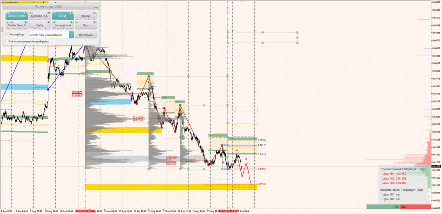 Среднесрочная тенденция: в шорт. Максимальное скопление объемов среднесрочной тенденции расположено в диапазоне по котировкам 0.63374-0.63437. В настоящий момент по паре совершаются инвестиционные операции ниже, указывая на силу продавцов. Наблюдаем скопление объемов по котировкам 0.62776-0.62829 и 0.61753-0.61840. В настоящий момент по паре совершаются инвестиционные операции ниже, указывая на силу продавцов.