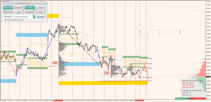 Среднесрочная тенденция: в шорт. Максимальное скопление объемов среднесрочной тенденции расположено в диапазоне по котировкам 0.69302-0.69376. В настоящий момент по паре совершаются инвестиционные операции ниже, указывая на силу продавцов. Объемы последнего шортового импульса по котировкам 0.68755-0.68853. В настоящий момент по паре совершаются инвестиционные операции ниже, указывая на силу продавцов.