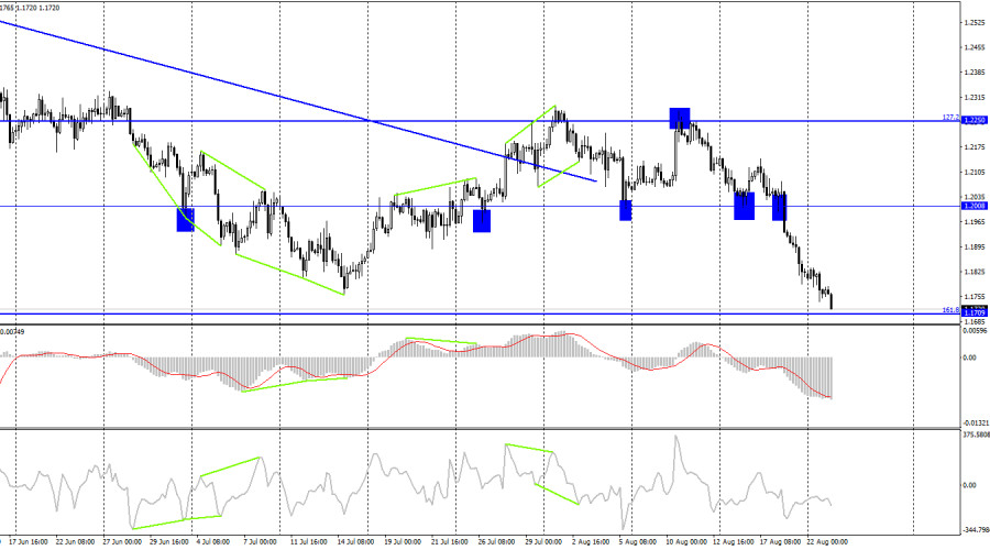 Добрый день, уважаемые трейдеры! На часовом графике пара GBP/USD в понедельник продолжала процесс падения в направлении уровня 1,1684. Продолжает она его и сегодня и уже сегодня может добраться до указанной цели. Отбой котировок от этого уровня сработает в пользу европейской валюты и некоторого роста в направлении уровня Фибо 323,6% - 1,1883. Закрепление курса пары под 1,1684 повысит вероятность дальнейшего падения в направлении следующего уровня 1,1496. Все что я говорил касаемо информационного фона в статье по евро-доллару, применимо и к британцу. Он также падает сейчас без видимых причин, так как информационный фон отсутствовал в начале текущей неделе. Возможно, на прошлой неделе отчеты повлияли на настроение трейдеров. Хотя сделали они это как-то однобоко. Однако начало текущей недели показывает, что продавать британца трейдеры готовы и без информационного фона. Таким образом, можно поставить под сомнение предположение, что на прошлой неделе трейдеры вообще обращали внимание на британскую статистику. Евро и фунт падают практически одинаково, а вот информационный фон у них не одинаковый. Поэтому я могу предположить, что отчеты и новости сейчас особо не интересуют трейдеров. Тогда индексы деловой активности, которые выйдут сегодня в Великобритании и США, тоже не имеют никакого значения. Британские индексы могут опять снизиться, но сейчас предполагается, что они останутся выше уровня 50. Американский индекс деловой активности в сфере услуг уже скатился ниже уровня 50, но каким бы ни было его значение сегодня, я сомневаюсь, что трейдеры прекратят покупки американца из-за одного индекса. Сейчас на настроение трейдеров влияют явно более глобальные факторы и вряд ли один индекс испортит им настроение. Фактором этим может быть рост ожиданий повышения ставки ФРС в сентябре. Несмотря на то что ФРС может сбавить обороты и поднять ставку только на 0,50%, она все равно будет выше ставки Банка Англии. На 4-часовом графике пара выполнила падение к уровню коррекции 161,8% - 1,1709. Отбой от уровня 1,1709 сработает в пользу британца и некоторого роста в направлении уровня 1,2008. Закрепление курса пары под уровнем 1,1709 повысит шансы на дальнейшее падение в направлении следующего уровня 1,1496. Назревающих дивергенций сегодня не наблюдается, но они сейчас и не имеют значения, так как движение безоткатное. Отчет Commitments of Traders (COT):