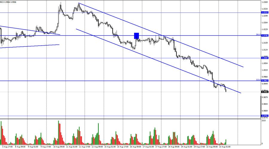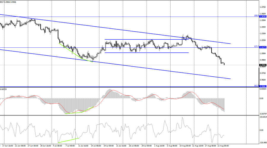 EUR/USD. 23 августа. Европеец падает, не останавливаясьИнстаФорекс - Instaforex, 3 года назад Добрый день, уважаемые трейдеры! Пара EUR/USD в понедельник продолжала процесс падения и к концу дня выполнила закрепление под уровнем коррекции 323,6% - 0,9963. Сегодняшний день начался тоже с падения в направлении уровня 0,9782. Нисходящий трендовый коридор продолжает характеризовать настроение трейдеров как «медвежье», а котировки пары уже сейчас падают быстрее, чем снижается сам коридор. Это говорит о том, что падение не просто сильное, оно еще и усиливается. Парадокс заключается в том, что в понедельник не было никакого информационного фона. Не было его и в пятницу, а сегодня несколько отчетов будет, но они будут позже, а евровалюта уже успела упасть на 40 пипсов. Таким образом, трейдеры не намерены сейчас ждать важной статистики или торговать пару только после того, как получат важную информацию. Настроение на рынке «медвежье», и этого вполне достаточно для того, чтобы трейдеры продолжали распродавать евровалюту. Стоит ли в такой ситуации затрагивать тему информационного фона этой недели вообще? С моей точки зрения, нет. Важных данных на этой неделе будет немного, но даже они трейдерам сейчас совершенно не нужны. Падение евровалюты может продолжаться, несмотря на любые значения индексов деловой активности в Евросоюзе или США, которые выйдут сегодня. Несмотря на пятничное выступление Джерома Пауэлла, который может помочь трейдерам понять, насколько будет поднята ставка в сентябре. Все это сейчас неважно. Поэтому рекомендую ориентироваться сейчас по графическому анализу. А там картина следующая: есть нисходящий коридор, значит нужно продавать. Покупать можно будет, когда трейдеры-быки сумеют закрепиться над нисходящим коридором. Пожалуй, больше сказать про пару евро-доллар сейчас нечего. Хотя есть еще один довольно важный момент: когда трейдеры вот так, как сейчас, избавляются от одной из валют, очень сложно предугадать, когда это движение завершится. Я совершенно не удивлюсь, если падение будет продолжаться еще довольно долгое время. На 4-часовом графике пара выполнила разворот в пользу валюты США и закрепление под уровнем коррекции 127,2% - 1,0173. Паре так и не удалось выполнить закрепление над нисходящим трендовым коридором, поэтому он продолжает характеризовать текущее настроение трейдеров, как «медвежье». Процесс падения может быть продолжен в направлении уровня Фибо 161,8% - 0,9581. Назревающих дивергенций сегодня не наблюдается ни у одного индикатора, но они в любом случае сейчас бессмысленны, так как падение безостановочное. Отчет Commitments of Traders (COT):