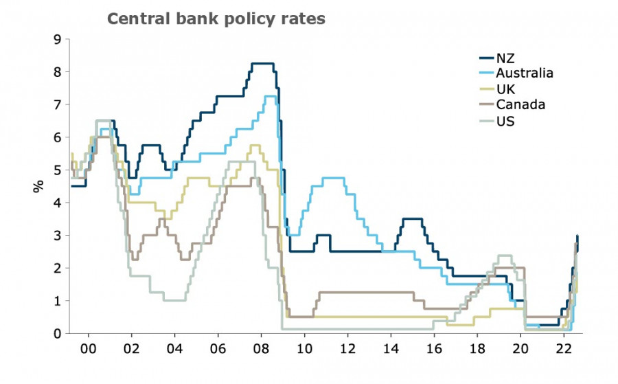 Снижение спроса на риск в ожидании выступления Дж.Пауэлла. Обзор USD, NZD, AUDИнстаФорекс - Instaforex, 3 года назад Чем ближе выступление главы ФРС Дж.Пауэлла в Джексон-Хоуле, тем меньше спрос на риск. Ястребиные сигналы от представителей ФРС в последнее время, а также ястребиные слова ЕЦБ о повышении ставок даже в условиях растущих рисков рецессии в Германии привели к переоценке взглядов рынков на ставки. Тяжелое энергетическое положение в Европе и новости о том, что инфляция в Великобритании достигла 18,6%, говорят о том, что пик инфляции еще не наступил, и остается риск того, что инфляция будет оставаться на высоком уровне дольше без дальнейших агрессивных действий мировых ЦБ. Сокращение спроса на риск приводит к росту доходностей ГКО, снижению фондовых индексов. В то же время сырьевой рынок пока удерживается от падения, чему способствовало заявление министра энергетики Саудовской Аравии, в котором он отметил высокую волатильность и отсутствие ликвидности на фьючерсном рынке, что, в свою очередь, может вынудить ОПЕК+ принять меры. Вероятнее всего, до пятницы торговля будет идти преимущественно в сложившихся диапазонах, преимуществом будут пользоваться доллар США, иена и другие защитные активы. NZDUSD РБНЗ, как и ожидалось, поднял ставку по итогам заседания на прошлой неделе на 50п. до 3.0%, общий тон сопроводительного документа был в целом ястребиным, прогноз по пиковому значению ставки в 2023г. повышен с 3.9% до 4.1%. По темпам прироста процентной ставки РБНЗ вышел в лидеры. Внутреннее инфляционное давление в Новой Зеландии оказалось значительно сильнее, чем ожидал РБНЗ ранее, поэтому прогноз по ставке повышен, и даже угроза быстрого приближения рецессии не даст оснований для остановки, поскольку лучше всего поднять ставки и сдержать инфляцию до того, как наступит рецессия. Еще один важный момент в заявлении РБНЗ – возможность пересмотра уровня нейтральной ставки в сторону повышения, если такой пересмотр будет осуществлен, то это поставит ЦБ перед необходимостью на такой же уровень поднять и процентную ставку, в противном случае ЦБ не сможет выдержать баланс между стимулирующей и ограничительной политиками. По всей видимости, нейтральная ставка уже выросла. На это указывает быстрый рост средней заработной платы ( в частном секторе +7% г/г), уже прогнозируется рост до 8.5%, что усиливает внутреннее инфляционное давление и увеличивает вероятность повышения ставки до 4% уже к концу года. Если события пойдут по такому сценарию, то это даст киви немного преимущества перед долларом. Позиционирование по NZD по-прежнему близко к нейтральному, недельное изменение +130 млн, бычий перевес минимальный (+112 млн), расчетная цена удерживается выше долгосрочной средней, несмотря на распродажи на споте. Движение на юг расцениваем как коррекционное, киви, возможно, найдет поддержку на текущем уровне, шансы удержаться выше локального минимума 0.6050 выглядят убедительно. Сценарий, при котором в ближайшие дни последует попытка подняться к локальному максимуму 0,6463 с последующим переходом в боковой диапазон, имеет более высокие шансы на реализацию, чем продолжение снижения. AUDUSD Индексы деловой активности PMI показали, что в экономике Австралии наступает перелом от расширения к сжатию. Композитный индекс упал с 51.1п до 49.8п в августе, снижение в значительной степени вызва