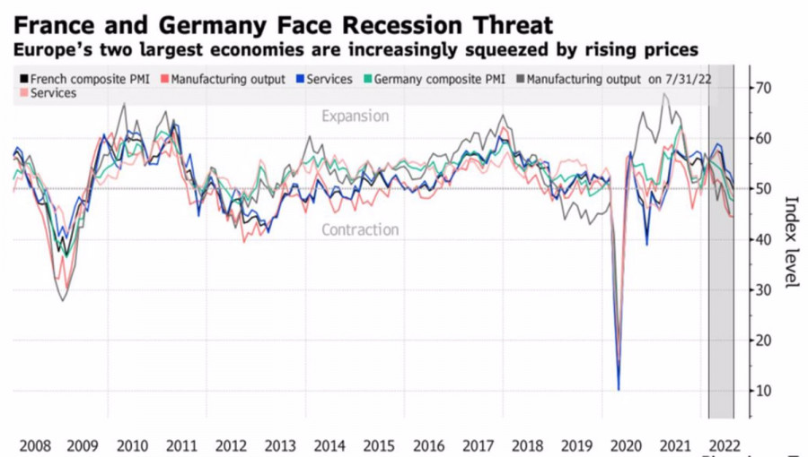Евро не смог слезть с иглыИнстаФорекс - Instaforex, 3 года назад Январь 2000. Евро впервые в своей истории падает ниже паритета с долларом США на ожиданиях, что ФРС будет повышать ставку по федеральным фондам. Затраты по займам наверняка вырастут и в Штатах, и в еврозоне, однако горячая американская экономика сигнализирует, что Федрезерв будет опережать ЕЦБ. В результате пара EURUSD двинулась к историческому минимуму в 0,824 и пробыла ниже паритета до конца 2002. Почти два года потребовалось «быкам» чтобы отыграть потери. Как будет на этот раз? ФРС уже опережает Европейский центробанк. Она подняла ставку по федеральным фондам на 225 б.п. с начала цикла ужесточения денежно-кредитной политики, на что Кристин Лагард и ее коллеги ответили лишь 50 б.п. Денежные рынки сигнализируют, что в США затраты по займам вырастут на 75 б.п. в сентябре, в еврозоне – на 50 б.п. Скорость американской монетарной рестрикции по-прежнему выше, а европейская экономика явно слабее, так что вопрос обновления исторического дна парой EURUSD остается открытым. Действительно, вслед за немецкой экономикой с падением деловой активности ниже критической отметки 50 столкнулась и французская. В результате европейский композитный индекс менеджеров по закупкам намекает на сокращение ВВП валютного блока в третьем квартале. Если ЕЦБ продолжит повышать ставки, а он, без сомнения, это сделает, Центробанк лишь усугубит ситуацию – сделает рецессию глубже. Динамика деловой активности в Германии и Франции Падение EURUSD ниже паритета отражает не только высокий спрос на доллар США, но и является результатом пагубной зависимости ЕС от России. Сидящая на игле российского газа Европа не в состоянии в один момент с нее слезть. Сокращение поставок по Северному потоку до 20% его пропускной способности с последующим закрытием трубопровода на техническое обслуживание, которое может длиться бесконечно долго, взвинтили цены на голубое топливо к рекордным пикам. В результате возникала горючая смесь высокой инфляции, неподконтрольной ЕЦБ, и повышенных расходов домохозяйств, не позволяющих им тратить на другие вещи. Стагфляция с последующей рецессией крайне негативно воспринимается инвесторами и подталкивает EURUSD в направлении, по меньшей мере, 0,95. Конечно же, в обвале основной валютной пары виноват не только энергетический кризис, но и рынок акций США, который упорно требовал от ФРС нажать на тормоз в монетарной рестрикции с последующим снижением ставки по федеральным фондам в 2023. Нашел, что требовать! Даже замедление инфляции не заставит Федрезерв прекратить ужесточать денежно-кредитную политику. Работа Центробанка далеко не закончена, фондовые индексы это наконец-то осознали и начали падать, потянув за собой в бездну и евро. Технически на дневном графике EURUSD был активирован паттерн AB=CD с таргетом на 161,8%, который расположен вблизи отметки 0,97. Продолжаем продавать евро, по меньшей мере до Джексон Хоула. Там «ястребиная» риторика Джерома Пауэлла может привести к фиксации прибыли и откату. Материал предоставлен компанией InstaForex - www.instaforex.com |