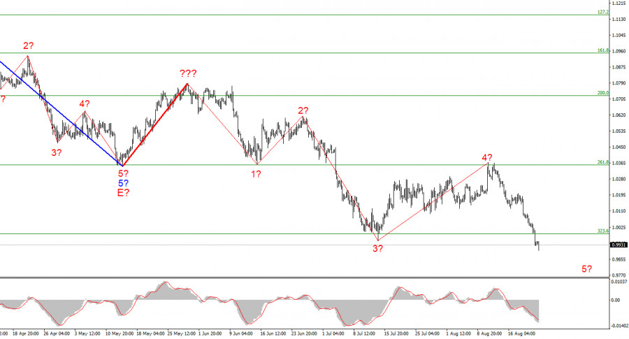 Анализ EUR/USD. 23 августа. Индексы деловой активности в Германии упали ниже отметки 50,0ИнстаФорекс - Instaforex, 3 года назад Волновая разметка 4-часового графика для инструмента Евро/Доллар на данный момент по-прежнему не требует внесения коррективов, несмотря на то что повышение котировок в рамках предполагаемой волны 4 выдалось сильнее, чем я ожидал. Новая волновая разметка пока не учитывает восходящую волну, отмеченную жирной красной линией. Вся волновая структура может усложниться еще раз, однако любая структура всегда может принять более сложный и протяженный вид. Сейчас завершено построение восходящей волны, которая трактуется как волна 4 понижательного участка тренда. Если это предположение верно, то инструмент продолжает построение нисходящей волны 5. Предполагаемая волна 4 приняла пяти волновой, но коррекционный, вид, однако все еще может считаться именно волной 4. Оснований предполагать завершение нисходящего участка тренда нет. Неудачная попытка прорыва отметки 1,0356, что приравнивается к 261,8% по Фибоначчи, указывает на неготовность рынка к продолжению покупок валюты Евросоюза. А удачная попытка прорыва 0,9989, что соответствует 323,6% по Фибоначчи, наоборот, на готовность продолжать снижать спрос на евро. Я ожидаю, что снижение котировок инструмента продолжится с целями, расположенными ниже отметки 1,0000 в рамках волны 5. Волна 5 может принять практически любой по протяженности вид, так как волна 4 выдалась гораздо длиннее волны 2. Деловая активность в Евросоюзе продолжает снижатьсяИнструмент Евро/Доллар в понедельник снизился на 100 базовых пунктов, а сегодня – еще на 20. Таким образом, рынок продолжает снижать спрос на евровалюту. Сегодня несколько часов назад вышли первые отчеты на этой неделе. В Германии и Евросоюзе стали известны индексы деловой активности. В Германии деловая активность в сфере услуг снизилась до 48,2 пункта, в сфере производства – выросла до 49,8 пункта, а составной индекс - упал до 47,6. В Евросоюзе деловая активность в сфере услуг сократилась до 50,2 пункта, в сфере производства – до 49,7 пункта, а составной индекс упал до 49,2. Таким образом, 5 из 6 индексов оказались по итогам августа ниже ключевой отметки 50,0, ниже которой считается, что сфера сокращается, а не развивается и растет. Безусловно, это негативный знак для евровалюты, но странно – именно после этих отчетов евровалюта немного повысилась. Впрочем, я бы не стал делать никаких выводов после этого роста. Спрос на евро продолжает снижаться и только за последние две недели инструмент упал почти на 500 базовых пунктов. Отход от достигнутых минимумов на 30 пунктов ни о чем не говорит. Предполагаемая волна 5 уже может быть завершена или близиться к своему завершению, так как зашла за лоу волны 3. Однако размеры предыдущих волн дают возможность предположить, что она примет гораздо более протяженный вид. Таким образом, до завершения снижения инструмента еще далеко. Зато потом он может перейти к построению нового повышательного участка тренда. Хотя бы коррекционного. Общие выводыИсходя из проведенного анализа, я делаю вывод, что построение нисходящего участка тренда продолжается. Советую сейчас продавать инструмент с целями, расположенными около расчетной отметки 0,9397, что приравнивается к 423,6% по Фибоначчи, по каждому сигналу MACD «вниз» в расчете на построение волны 5. Пок