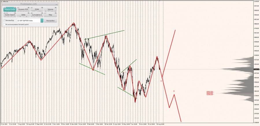 Альтернативный сценарий: при закреплении котировок индекса SNP500 выше зоны 1/2 (4222.76) при откатах искать покупки по паттерну в новом диапазоне выгодных цен, с целями: обновление максимумов и тестирование нижней границы НКЗ (4312.76).