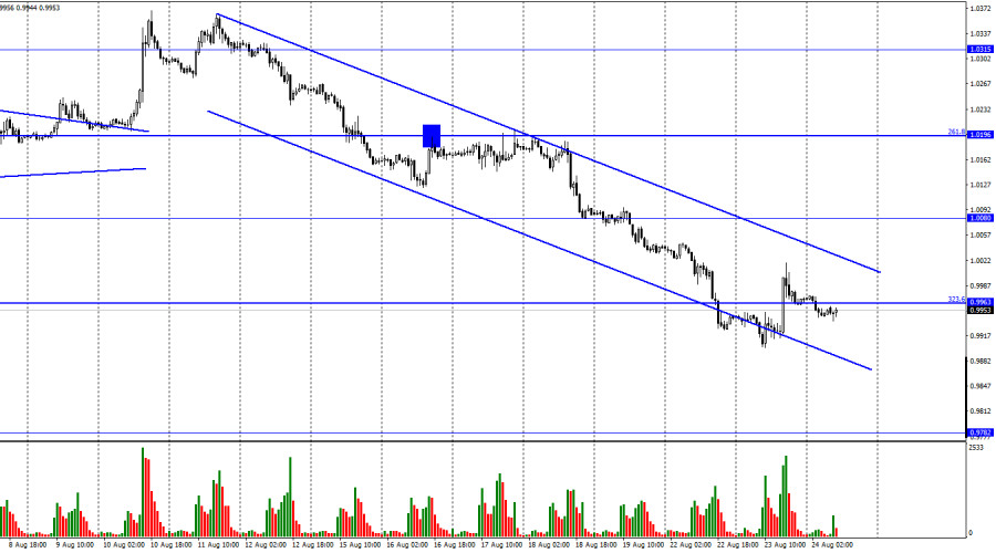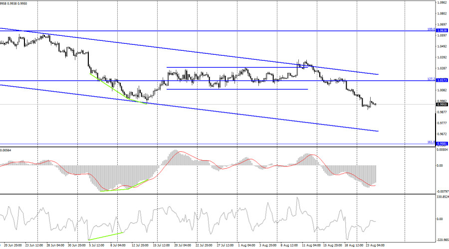 EUR/USD. 24 августа. Индекс деловой активности сектора услуг охладил трейдеров-медведей.ИнстаФорекс - Instaforex, 3 года назад Добрый день, уважаемые трейдеры! Пара EUR/USD во вторник продолжала процесс падения ровно до выхода индексов деловой активности в США. После того как данные стали доступны трейдерам, доллар США резко просел и отошел на 100 пипсов вверх. Однако нисходящий трендовый коридор продолжает характеризовать настроение трейдеров как «медвежье», поэтому падение котировок евровалюты может возобновиться в любой момент. Как стало известно вчера, индекс деловой активности в секторе услуг снизился до 44,1 пункта, а композитный индекс – до 45 пунктов. Трейдеры не ожидали такого сильного падения и начали на эмоциях избавляться от американской валюты, чем и была обусловлена коррекция. Но эта коррекция практически ничего не меняет в графическом плане, так как сразу после ее завершения падение котировок возобновилось в направлении уровня 0,9782. Что означает падение индексов деловой активности? То, что американская экономика понемногу замедляется, что можно считать началом рецессии. Напомню, что о рецессии сейчас ходит множество разговоров, а экономика США уже закончила первый и второй кварталы в минусе. Тем не менее ФРС пока отрицает факт начала рецессии, хотя трейдеры придерживаются иной точки зрения. Однако это совершенно не мешает им продолжать покупки доллара. Таким образом, статистика из США разочаровала вчера, но доллар все равно может продолжать рост. Сегодня выйдет новый отчет по заказам на товары долгосрочного использования. Если он будет также плох, как и вчерашние отчеты, это может вызвать новое падение доллара, но в целом я ожидаю, что он будет продолжать рост. На 4-часовом графике пара выполнила разворот в пользу валюты США и закрепление под уровнем коррекции 127,2% - 1,0173. Паре так и не удалось выполнить закрепление над нисходящим трендовым коридором, поэтому он продолжает характеризовать текущее настроение трейдеров как «медвежье». Процесс падения может быть продолжен в направлении уровня Фибо 161,8% - 0,9581. Назревающих дивергенций сегодня не наблюдается ни у одного индикатора, но они в любом случае сейчас бессмысленны, так как падение безостановочное. Отчет Commitments of Traders (COT):