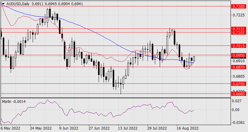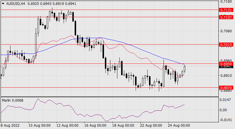 Прогноз по AUD/USD на 25 августа 2022 годаИнстаФорекс - Instaforex, 3 года назад Вчера австралийский доллар снизился на 20 пунктов, а сегодня утром подрос уже на 25 пунктов. Перед ценой расположено сопротивление 0.6950, осциллятор Марлин близ нулевой линии. Если состоится одновременный переход цены над 0.6950 и осциллятора Марлин в положительную область, то цена получит импульс к росту до целевого уровня 0.7015. Но если произойдёт разворот цены и осциллятора, то вновь совершится атака на 0.6870. Последующий уход под поддержку открывает цель 0.6755.