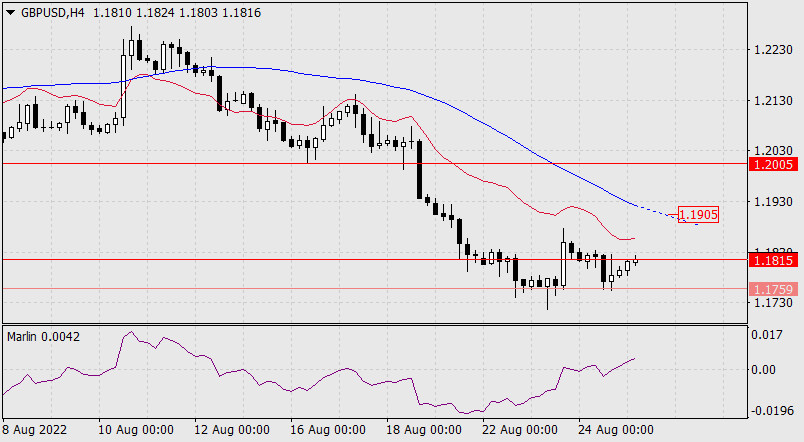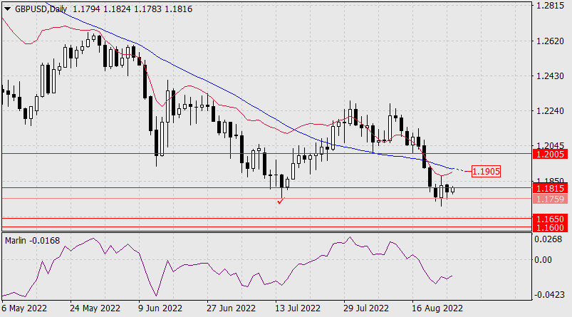 Прогноз по GBP/USD на 25 августа 2022 годаИнстаФорекс - Instaforex, 3 года назад В среду фунт стерлингов снизился на 34 пункта. Нижняя тень дневной свечи коснулась сигнального уровня 1.1759 (минимум 14 июля), верхняя часть свечи вышла над уровень сопротивления 1.1815. Сегодня утром цена вновь пытается выйти над данное сопротивление и если попытка удастся, то возможно увеличение коррекции до линии Крузенштерна в район 1.1905. закрепление под 1.1759 восстановит нисходящее движение к целям 1.1650 и 1.1600.