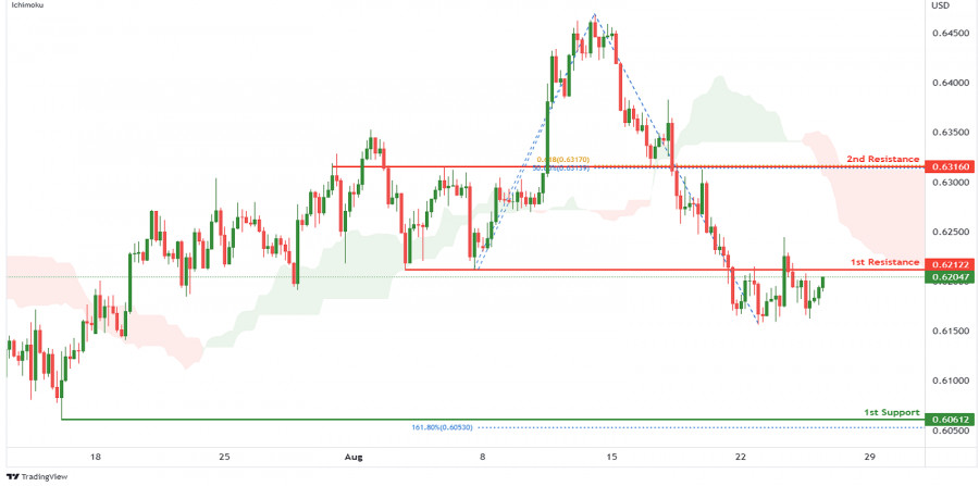 NZD/USD: возможно снижение. Прогноз на 25 августа 2022 г.ИнстаФорекс - Instaforex, 3 года назад На 4-часовом графике пара NZD/USD движется ниже индикатора Облако Ишимоку, что указывает на медвежий импульс. Ожидается, что цена упадет от 1-го уровня сопротивления 0.62122, соответствующего перекрытию, выступающему в роли сопротивления, до 1-го уровня поддержки 0.60612, который соответствует уровню свинг-лоу, выступающему в качестве поддержки, и уровню расширения Фибоначчи 161.8%. В качестве альтернативы цена может пробить 1-й уровень сопротивления и подняться до 2-го уровня сопротивления 0.63160, соответствующего перекрытию, выступающему в роли сопротивления, 50% уровню коррекции Фибоначчи и 61.8% проекции Фибоначчи. Торговая рекомендация Вход: 0.62122 Условия для входа: перекрытие, выступающее в роли сопротивления Тейк-профит: 0.60612 Условия для фиксации прибыли: уровень свинг-лоу, выступающий в качестве поддержки, и уровень расширения Фибоначчи 161.8% Стоп-лосс: 0.63160 Условия для активации ордера стоп-лосс: перекрытие, выступающее в роли сопротивления, 50% уровень коррекции Фибоначчи и 61.8% проекция Фибоначчи Материал предоставлен компанией InstaForex - www.instaforex.com |
