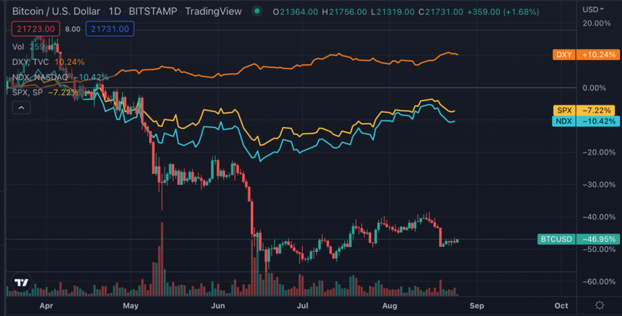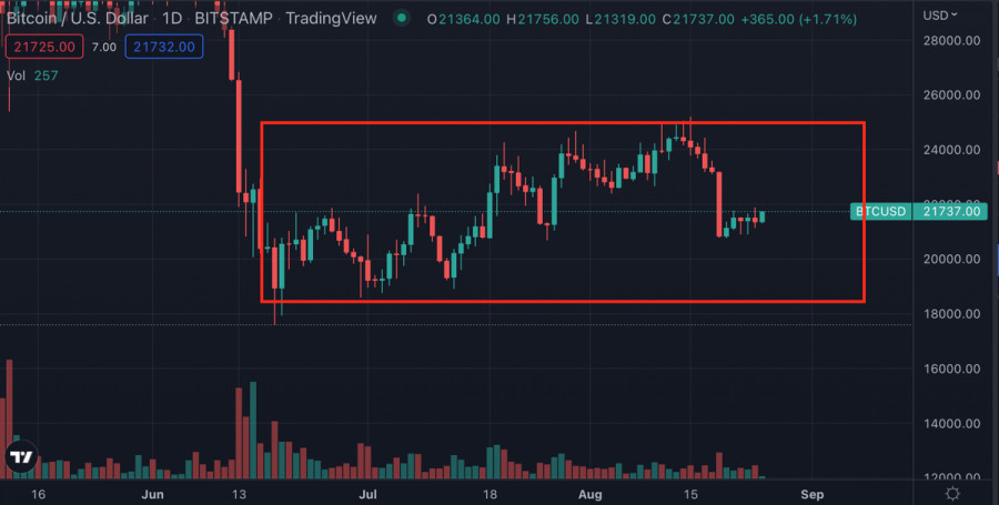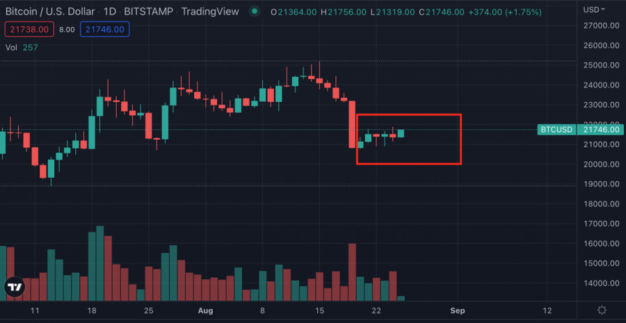Биткоин демонстрирует устойчивость к негативу: что мешает криптовалюте начать рост?ИнстаФорекс - Instaforex, 3 года назад Биткоин продолжает удерживать важную зону поддержки на отметке $21k-$21,4k. Криптовалюта четырежды тестировала круглый уровень за последние пять дней, но конечного результата медведи достичь не могут. Биткоин сформировал три неуверенных свечи подряд, что указывает на паритет продавцов и покупателей с одной стороны. Если посмотреть на эту ситуацию с другой стороны, то можно сделать вывод, что формирование свечей "доджи" связано с низкими объемами торгов на крипторынке. За последние три месяца Биткоин и весь рынок движутся в рамках широкого диапазона колебаний $18k-$25k. Все столкновения быков и медведей происходит именно в этом диапазоне. Некоторые аналитики считают формирование определенного диапазона движения цены Биткоина в рамках медвежьего тренда признаком устойчивости. С другой стороны, при попытке выйти за пределы данной области цена встречает ожесточенное сопротивление и снижается к локальным зонам поддержки. Однако если сравнивать с положением дел на фондовом и крипторынках, то можно сделать вывод, что капитализация цифровых активов практически не меняется в течение последних трех месяцев. Корреляция Биткоина и фондовых индексов является одной из причин неудачного роста криптовалюты. Рыночная ситуация предполагает избежание больших рисков, что делает фондовые индексы и BTC взаимосвязанными. Поэтому завершение коррекции DXY, которое ударило по фондовым показателям, также отразилось на Bitcoin. Прямой корреляции между BTC и DXY не существует за счет того, что возможности криптовалюты гораздо шире, чем фондовых индексов. После массовой капитуляции инвесторов в июне, темпы накопления монет BTC значительно возросли, что постепенно приводит к его дефицитности, а следовательно, и востребованности. С таким мнением согласен и старший рыночный аналитик площадки Oanda Эдвард Мойя. Специалист считает, что на рынке появляется все больше инвесторов, готовых покупать значительные объемы BTC и других криптовалют. Это говорит о завершении периода абсолютного страха на рынке, когда торговая активность сводилась к минимуму. Стоит добавить, что эта тенденция только зародилась и склонность к риску набирает популярность. Однако понадобится время для того, чтобы инвестиционные объемы среди инвесторов росли массово. Поэтому в среднесрочной перспективе Биткоину стоит ожидать сохранения текущей динамики движения цены без существенных изменений. Вместе с тем в краткосрочной перспективе криптовалюта может получить топливо, которое стало главным катализатором роста цены – позитивные новости. В ближайшие дни пройдет выступление главы ФРС Джерома Паэлла, где будут обозначены дальнейшие планы регулятора и общую ситуацию с экономикой США. Хедж-фонды уверены в сохранении курса на ястребиную политику по повышению ключевой ставки и намеренно шортят евродоллар. В августе объемы коротких позиций выросли в три раза. Эта тенденция может вынудить ФРС изменить текущую политику, чтобы не допустить падения евро. При таком развитии событий, Биткоин может получить локальный импульс для попытки взобраться выше $23k. Также сегодня будет опубликована отчетность по ВВП США, и при сохранении нисходящей тенденции, ФРС может официально объявить 