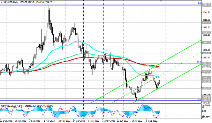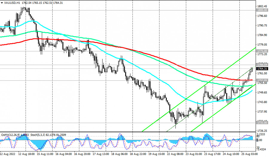 XAU/USD: технический анализ и торговые рекомендации на 25.08.2022ИнстаФорекс - Instaforex, 3 года назад Как мы отметили в нашем сегодняшнем «Фундаментальном анализе», на фоне ослабления доллара и усиливающихся рисков по поводу рецессии в США и в мировой экономике котировки золота вновь перешли к росту. XAU/USD растёт сегодня 3-й день подряд, а на момент публикации данной статьи торгуется вблизи отметки 1764.00, в непосредственной близости от сильного уровня сопротивления 1766.00 (ЕМА200 на 4-часовом графике). В случае его пробоя целью становится важный уровень сопротивления 1775.00 (ЕМА50 на дневном графике), пробой которого усилит вероятность дальнейшего коррекционного роста в сторону ключевых уровней сопротивления 1800.00, 1819.00 (ЕМА200 на дневном графике). Их пробой подтвердит возврат XAU/USD в зону долгосрочного бычьего рынка. В альтернативном сценарии от уровня сопротивления 1766.00 произойдет отбой, а пара XAU/USD возобновит снижение. Первым сигналом для открытия коротких позиций станет пробой важного краткосрочного уровня поддержки 1757.00 (ЕМА200 на 1-часовом графике). Пробой ключевого уровня поддержки 1690.00 (ЕМА200 на недельном графике) обусловит выход XAU/USD в зону долгосрочного медвежьего рынка. *) об особенностях торговли XAU/USD см. также XAU/USD: валютная пара (характеристики, рекомендации). Уровни поддержки: 1757.00, 1748.00, 1700.00, 1690.00, 1682.00 Уровни сопротивления: 1766.00, 1775.00, 1800.00, 1819.00, 1832.00, 1875.00