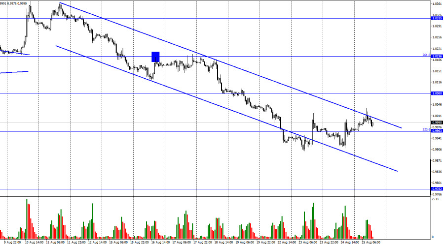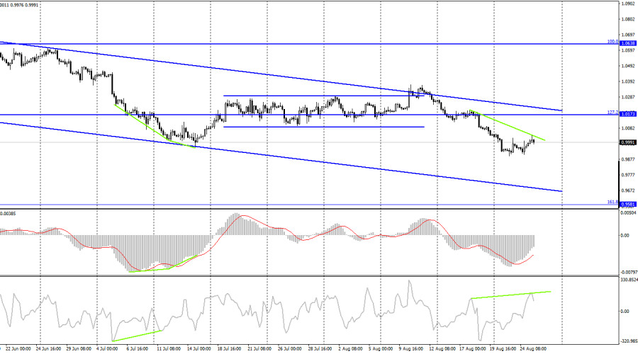 EUR/USD. 25 августа. Доллар взял паузу из-за слабой статистики и необходимости немного отдохнутьИнстаФорекс - Instaforex, 3 года назад Добрый день, уважаемые трейдеры! Пара EUR/USD в среду и четверг продолжала довольно слабый рост, не обращая никакого внимания на уровень коррекции 323,6% - 0,9963. Напомню, что на этой неделе пока самым важным событием можно признать отчет по деловой активности в США в секторе услуг. В прошлом месяце он упал до 47 пунктов, в этом – до 44. Следует понимать, что сам по себе показатель деловой активности не отображает конкретных изменений в экономике. Он отображает настроение менеджеров по закупкам. Если они совершают больше сделок, индекс растет. Если меньше – падает. Однако слабый индекс не означает, что производство останавливается, а сектор услуг уходит в рецессию. Тем не менее падение ниже 50 всегда отмечается трейдерами как негативный момент. Иными словами, с моей точки зрения, переживать стоило тогда, когда выше отчет по ВВП в первом или втором квартале, потому что он показал реальное сокращение экономики. Тем не менее еще позавчера трейдеры продавали доллар после этого отчета, а вчера... они тоже продавали доллар, в такое же самое время при отсутствии информационного фона. Таким образом, я думаю, что в данное время пара нашла свое локальное дно. Она показывала падение две недели, причем далеко не каждый день был информационный фон, на который можно было бы списать плохое настроение у трейдеров. Сейчас просто настало время небольшой паузы. Вместе с тем котировки выполнили рост сегодня к верхней линии нисходящего трендового коридора, который продолжает характеризовать настроение трейдеров как «медвежье». Отбой от этой линии позволяет трейдерам рассчитывать на возобновление падения в направлении уровня 0,9782. Закрепление над ней сработает в пользу продолжения роста европейской валюты. Но уже завтра вечером состоится выступление президента ФРС Джерома Пауэлла в Джексон-хоуле, и это событие может очень сильно повлиять на настроение трейдеров. Я не вижу смысла гадать, что именно скажет Пауэлл. Однако вырасти после его речи может и евро, и доллар. На 4-часовом графике пара выполнила разворот в пользу валюты США и закрепление под уровнем коррекции 127,2% - 1,0173. Паре так и не удалось выполнить закрепление над нисходящим трендовым коридором, поэтому он продолжает характеризовать текущее настроение трейдеров, как «медвежье». Процесс падения может быть продолжен в направлении уровня Фибо 161,8% - 0,9581. Сегодня назревает «медвежья» дивергенция у индикатора CCI, образование которой может сработать в пользу валюты США. Отчет Commitments of Traders (COT):
