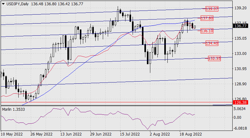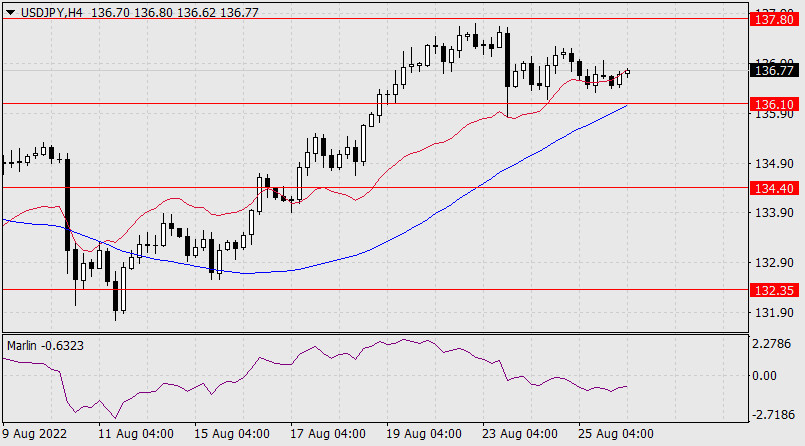 Прогноз по USD/JPY на 26 августа 2022 годаИнстаФорекс - Instaforex, 3 года назад Вчера пара USD/JPY снизилась на 65 пунктов, но атаковать поддержку ближайшей линии ценового канала не решилась. Сегодня в азиатскую сессию цена пытается подрасти, и пока непонятно насколько серьёзно её намерение выйти над сопротивление верхней вложенной линии ценового канала в области 137.80. Сопротивление усиливается индикаторной линией Крузенштерна.