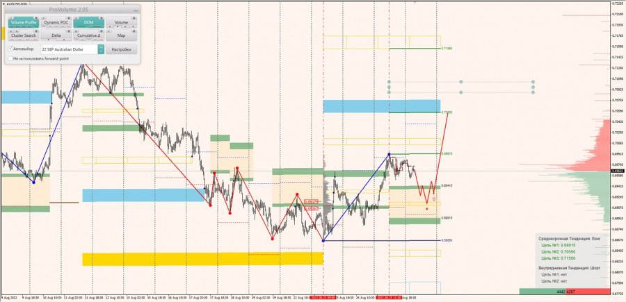 Среднесрочная тенденция: в лонг. Максимальное скопление объемов среднесрочной тенденции расположено в диапазоне по котировкам 0.69067-0.691741. В настоящий момент по паре совершаются инвестиционные операции выше, указывая на силу покупателей.