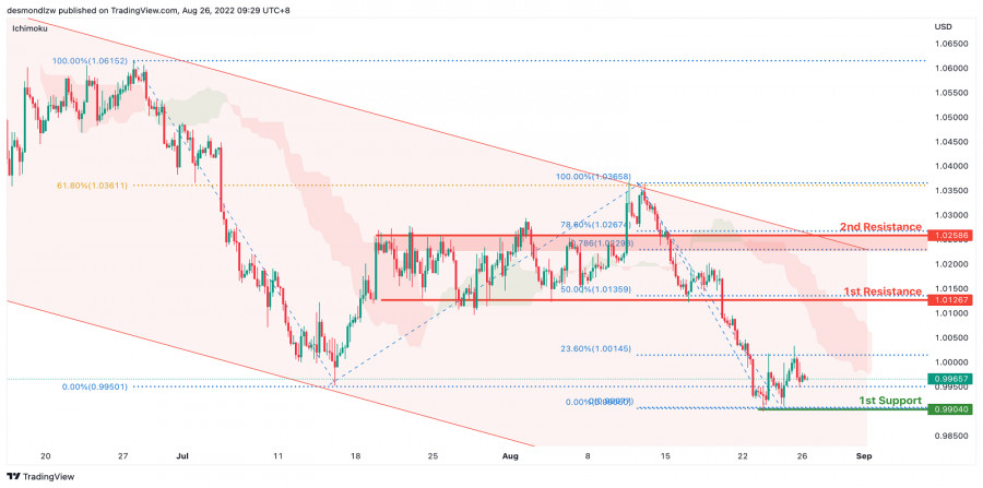 EUR/USD: ожидается дальнейшее развитие нисходящей тенденции. Прогноз на 26 августа 2022ИнстаФорекс - Instaforex, 3 года назад На 4-часовом графике пара EUR/USD по-прежнему торгуется в нисходящем тренде и движется ниже индикатора Ишимоку, что указывает на медвежий импульс. Цена протестировала 1-й уровень поддержки 0.9904, соответствующий проекции Фибоначчи 61.8%, и не смогла пробить уровень 1.00, который соответствует уровню коррекции Фибоначчи откат 23.6%. Если паре не удастся пробить 1-й уровень поддержки, цена может откатиться, чтобы протестировать 1-й уровень сопротивления 1.0126, соответствующий предыдущему уровню свинг-лоу и 50% уровню коррекции Фибоначчи, а затем 2-ой уровень сопротивления 1.0258, который соответствует 78.6% уровню коррекции Фибоначчи и уровню свинг-хай. Торговая рекомендация Вход: 1.001 Условия для входа: откат, уровень коррекции Фибоначчи 23.6% Тейк-профит: 0.9904 Условия для фиксации прибыли: нисходящий тренд и предыдущий уровень свинг-лоу Стоп-лосс: 1.009 Условия для активации ордера стоп-лосс: предыдущий уровень свинг-лоу Материал предоставлен компанией InstaForex - www.instaforex.com |