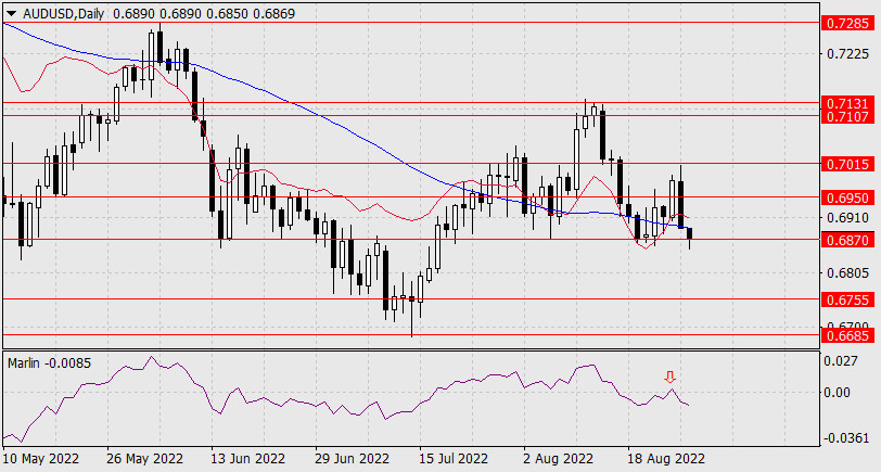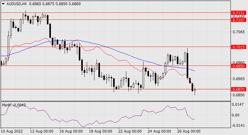 Прогноз по AUD/USD на 29 августа 2022 годаИнстаФорекс - Instaforex, 3 года назад В прошедшую пятницу австралийский доллар обвалился на 90 пунктов, развернувшись от целевого уровня 0.7015. Сегодня в азиатскую сессию цена преодолела поддержку 0.6870, открывается целевой уровень 0.6755. Осциллятор Марлин развернулся от нулевой линии вниз. Тенденция нисходящая.
