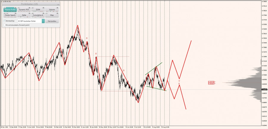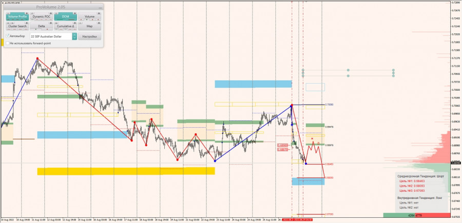 Среднесрочная тенденция: в шорт. Максимальное скопление объемов среднесрочной тенденции расположено в диапазоне по котировкам 0.68870-0.68989. В настоящий момент по паре совершаются инвестиционные операции ниже, указывая на силу продавцов.