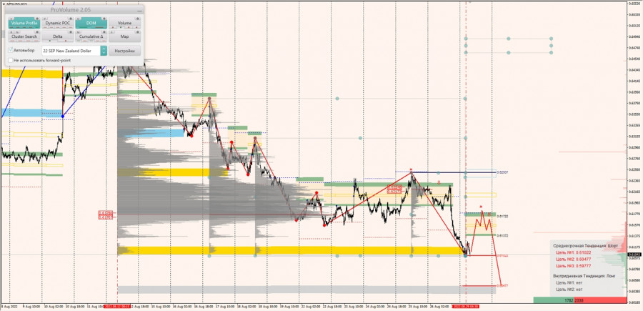 Среднесрочная тенденция: в шорт. Максимальное скопление объемов среднесрочной тенденции расположено в диапазоне по котировкам 0.61707-0.61786. В настоящий момент по паре совершаются инвестиционные операции ниже, указывая на силу продавцов.