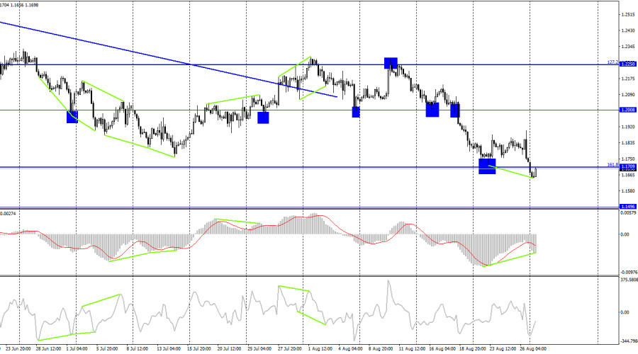 GBP/USD. 29 августа. Британец более чувствительно отреагировал на слова ПауэллаИнстаФорекс - Instaforex, 3 года назад Добрый день, уважаемые трейдеры! На часовом графике пара GBP/USD в пятницу выполнила рост к уровню коррекции 323,6% - 1,1883, отбой от него и разворот в пользу американского доллара. После этого началось сильное падение, в завершение которого британец очутился под уровнем 1,1684. Лишь сегодня утром он предпринял попытку выполнить закрытие над этим уровнем, но если евровалюта показала рост сегодня, то фунт – нет. Таким образом, процесс падения котировок может быть продолжен в направлении следующего коррекционного уровня 423,6% - 1,1306, а нисходящий трендовый коридор не допускает даже мысли, что британец может показать сильный рост в ближайшее время. В пятницу весь информационный фон сводился к выступлению Джерома Пауэлла, о котором я уже писал в статье по евро-доллару. Помимо выступления президента ФРС, вышли также отчеты по личным доходам и расходам американцев за июль. Я не могу сказать, что они оказались провальными, но были все же ниже ожиданий трейдеров. Они привели лишь к небольшому падению американской валюты, после которого доллар США очень быстро наверстал упущенное. Я склонен рассчитывать на то, что британец может немного отойти вверх в начале этой недели, после чего возобновит свое падение. До следующих заседаний Банка Англии и ФРС еще далеко, поэтому трейдеры могут сосредоточить свое внимание на других вещах. Сейчас рынки вовсю обсуждают рецессии в американской и британской экономиках, пытаясь угадать, где она будет сильнее. Пока что прогнозы и подсчеты говорят о том, что рецессия будет более сильной в США. Британская экономика может потерять всего лишь около 1%. А вот с инфляцией все гораздо сложнее, так как уже начали появляться цифры около 18% в качестве максимальной инфляции в 2022-2023 годах. В США, напомню, индекс потребительских цен уже начал замедляться, а с учетом повышения ставки, от которого ФРС не собирается отказываться, она будет только снижаться во времени. Как видим, на этом фоне растет именно доллар, поэтому предполагаю, что трейдеры больше вниманию уделяют именно ставкам, а не рецессии. На 4-часовом графике пара выполнила падение к уровню коррекции 161,8% - 1,1709 и закрепление под ним. Таким образом, процесс падения может быть продолжен в направлении уровня 1,1496. Была образована «бычья» дивергенция у индикатора MACD, но ее лучше сейчас «назревающей». Если она не образуется, то падению британца вообще ничего мешать не будет. Закрепление над уровнем 1,1709 сработает в пользу фунта и некоторого роста, который вряд ли будет сильным. Отчет Commitments of Traders (COT):