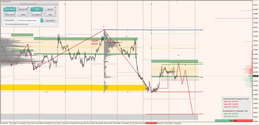 Среднесрочная тенденция: в шорт. Максимальное скопление объемов среднесрочной тенденции расположено в диапазоне по котировкам 0.61707-0.61786. В настоящий момент по паре совершаются инвестиционные операции ниже, указывая на силу продавцов.