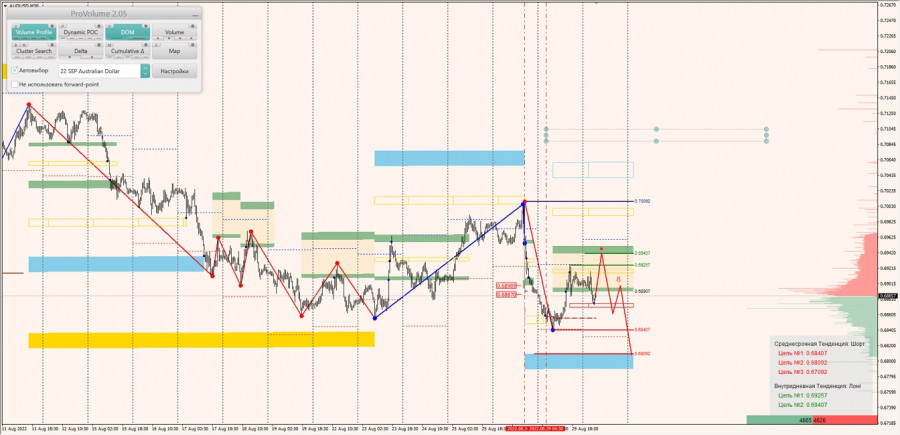 Среднесрочная тенденция: в шорт. Максимальное скопление объемов среднесрочной тенденции расположено в диапазоне по котировкам 0.68870-0.68989. В настоящий момент по паре совершаются инвестиционные операции ниже, указывая на силу продавцов.