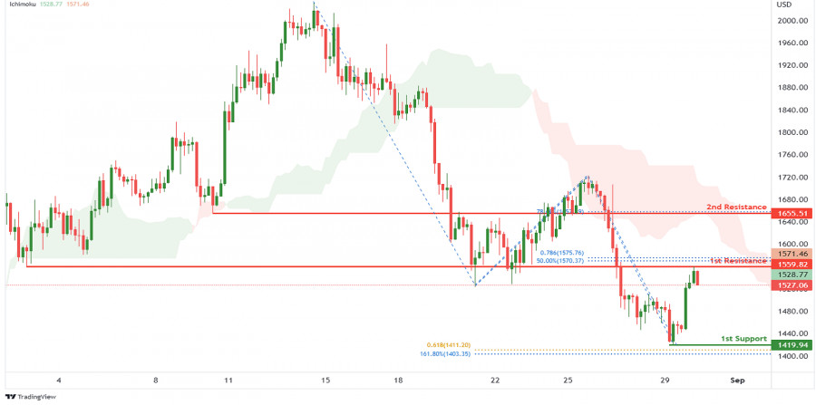 ETH/USD: ожидается формирование медвежьего импульса. Прогноз на 30 августа 2022ИнстаФорекс - Instaforex, 3 года назад На 4-часовом графике пара ETH/USD движется ниже индикатора Облако Ишимоку, что указывает на медвежий импульс. Ожидается, что цена упадет от 1-го уровня сопротивления 1559.82, соответствующего перекрытию, выступающему в роли сопротивления, 50% уровню коррекции Фибоначчи и 78.6% проекции Фибоначчи, до 1-го уровня поддержки 1419.94, который соответствует уровню свинг-лоу, выступающему в качестве поддержки, уровню расширения Фибоначчи 161.8% и проекции Фибоначчи 61.8%. В качестве альтернативы цена может пробить 1-й уровень сопротивления и укрепиться до 2-го уровня сопротивления 1655.51, соответствующего линии сопротивления и 78.6% уровню коррекции Фибоначчи. Торговая рекомендация Вход: 1559.82 Условия для входа: перекрытие, выступающее в роли сопротивления, 50% уровень коррекции Фибоначчи и 78.6% проекция Фибоначчи Тейк-профит: 1419.94 Условия для фиксации прибыли: уровень свинг-лоу, выступающий в качестве поддержки, уровень расширения Фибоначчи 161.8% и проекция Фибоначчи 61.8% Стоп-лосс: 1655.51 Условия для активации ордера стоп-лосс: линия сопротивления и 78.6% уровень коррекции Фибоначчи Материал предоставлен компанией InstaForex - www.instaforex.com |